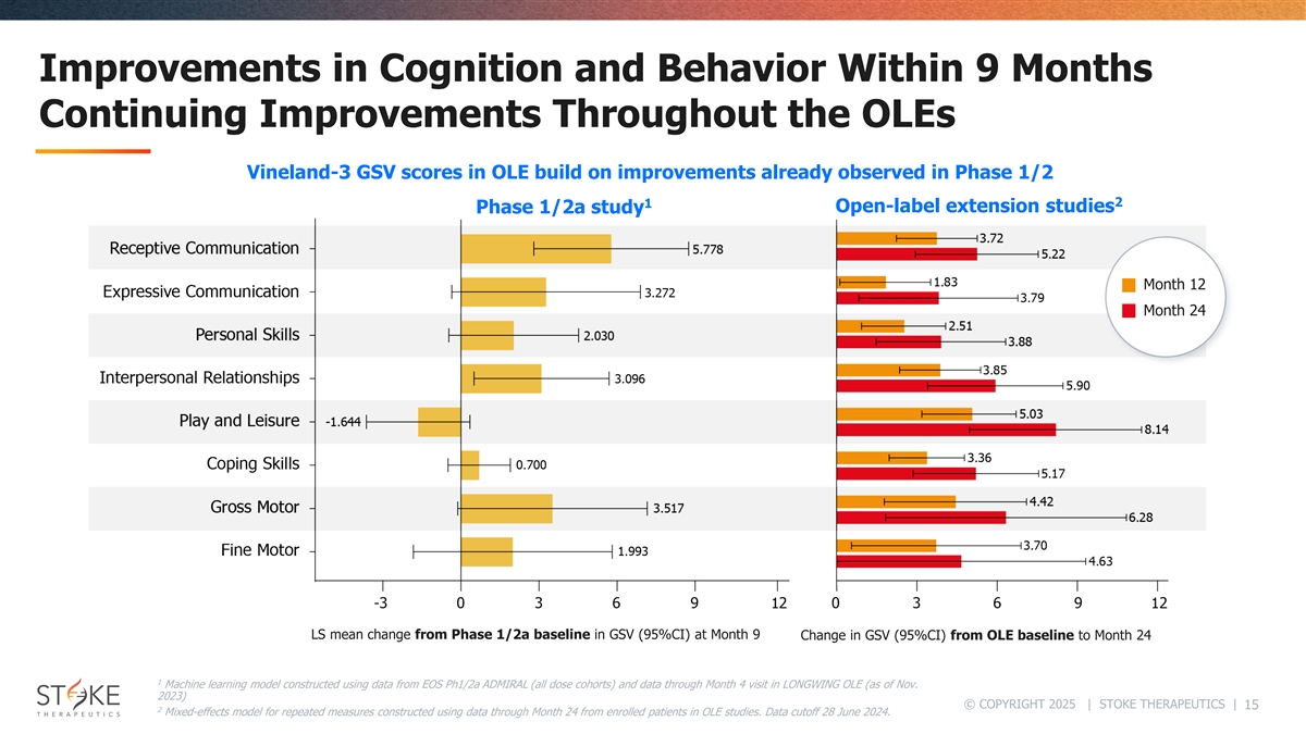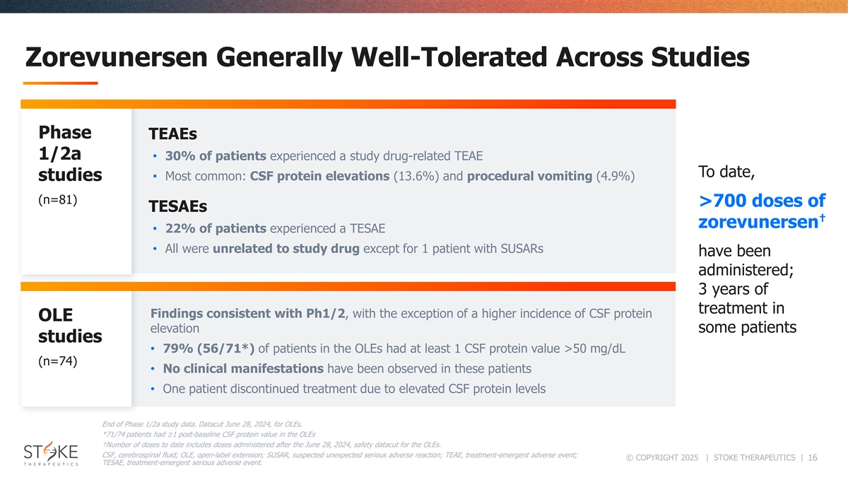 Improvements in Cognition and Behavior Within 9 Months Continuing Improvements Throughout the OLEs Vineland-3 GSV scores in OLE build on improvements already observed in Phase 1/2 2 1 Open-label extension studies Phase 1/2a study Month 12 Month 24 LS mean change from Phase 1/2a baseline in GSV (95%CI) at Month 9 Change in GSV (95%CI) from OLE baseline to Month 24 1 Machine learning model constructed using data from EOS Ph1/2a ADMIRAL (all dose cohorts) and data through Month 4 visit in LONGWING OLE (as of Nov. 2023) © COPYRIGHT 2025 | STOKE THERAPEUTICS | 15 2 Mixed-effects model for repeated measures constructed using data through Month 24 from enrolled patients in OLE studies. Data cutoff 28 June 2024.