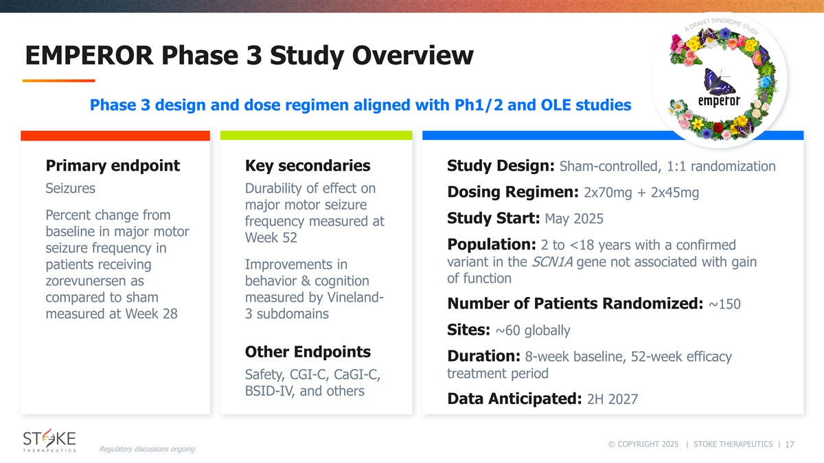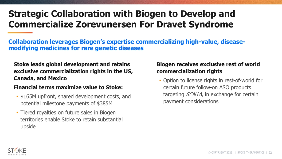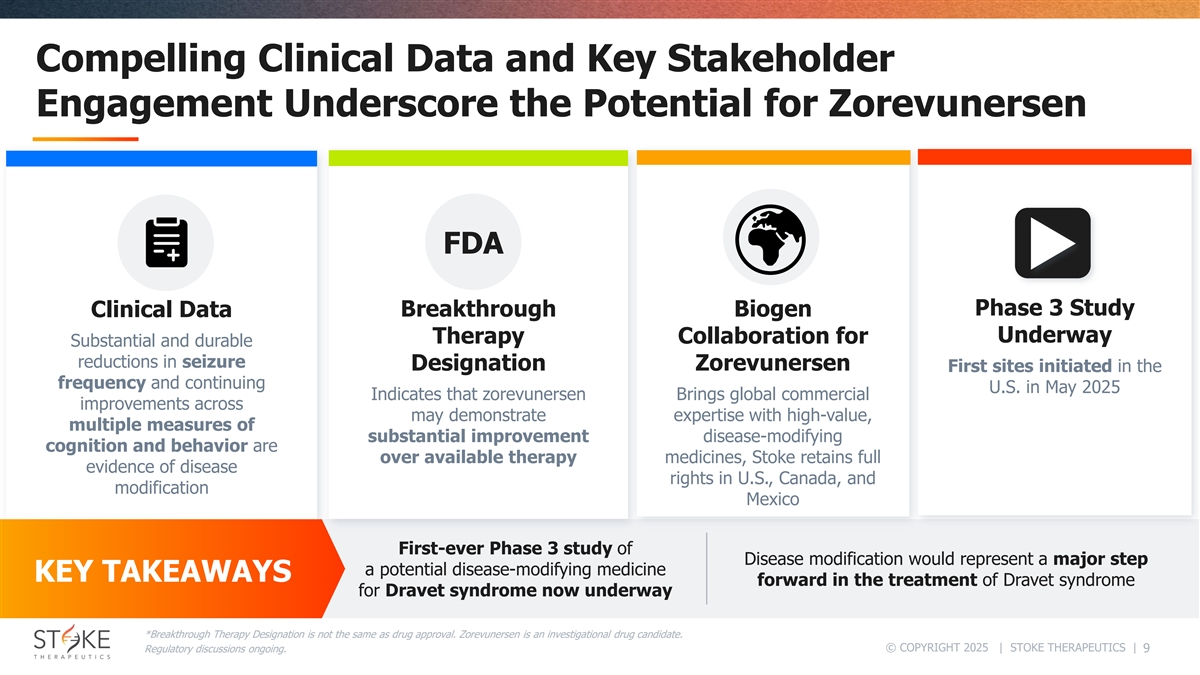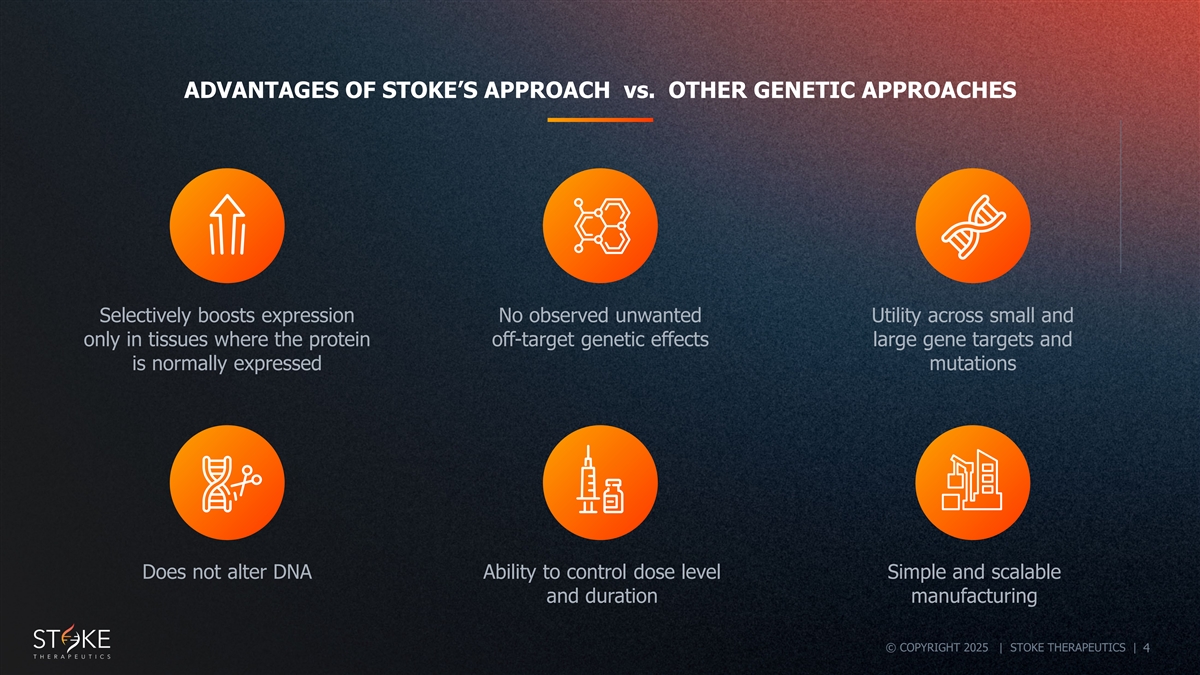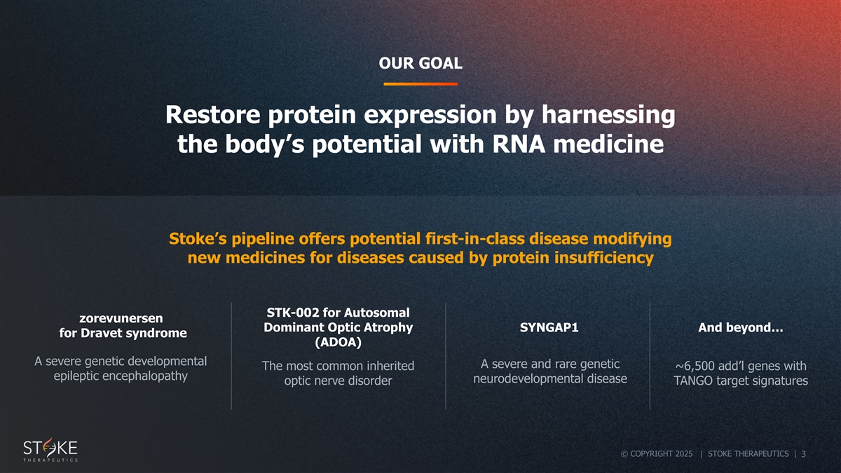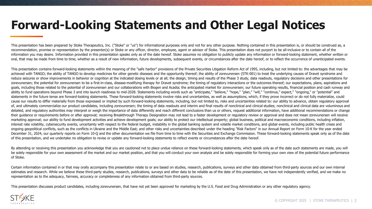 Forward-Looking Statements and Other Legal Notices This presentation has been prepared by Stoke Therapeutics, Inc. ( Stoke or us ) for informational purposes only and not for any other purpose. Nothing contained in this presentation is, or should be construed as, a recommendation, promise or representation by the presenter(s) or Stoke or any officer, director, employee, agent or advisor of Stoke. This presentation does not purport to be all-inclusive or to contain all of the information you may desire. Information provided in this presentation speaks only as of the date hereof. Stoke assumes no obligation to publicly update any information or forward-looking statement, whether written or oral, that may be made from time to time, whether as a result of new information, future developments, subsequent events, or circumstances after the date hereof, or to reflect the occurrence of unanticipated events. This presentation contains forward-looking statements within the meaning of the safe harbor provisions of the Private Securities Litigation Reform Act of 1995, including, but not limited to: the advantages that may be achieved with TANGO; the ability of TANGO to develop medicines for other genetic diseases and the opportunity thereof; the ability of zorevunersen (STK-001) to treat the underlying causes of Dravet syndrome and reduce seizures or show improvements in behavior or cognition at the indicated dosing levels or at all; the design, timing and results of the Phase 3 study, data readouts, regulatory decisions and other presentations for zorevunersen; the potential for zorevunersen to be a first-in-class, disease-modifying therapy for Dravet syndrome; the timing of regulatory interactions or the outcomes thereof; our expectations, plans, aspirations and goals, including those related to the potential of zorevunersen and our collaborations with Biogen and Acadia; the anticipated market for zorevunersen; our future operating results, financial position and cash runway and ability to fund operations beyond Phase 3 and into launch readiness to mid-2028. Statements including words such as anticipate, believe, hope, plan, will, continue, expect, ongoing, or potential and statements in the future tense are forward-looking statements. These forward-looking statements involve risks and uncertainties, as well as assumptions, which, if they prove incorrect or do not fully materialize, could cause our results to differ materially from those expressed or implied by such forward-looking statements, including, but not limited to, risks and uncertainties related to: our ability to advance, obtain regulatory approval of, and ultimately commercialize our product candidates, including zorevunersen; the timing of data readouts and interim and final results of nonclinical and clinical studies; nonclinical and clinical data are voluminous and detailed, and regulatory authorities may interpret or weigh the importance of data differently and reach different conclusions than us or others, request additional information, have additional recommendations or change their guidance or requirements before or after approval; receiving Breakthrough Therapy Designation may not lead to a faster development or regulatory review or approval and does not mean zorevunersen will receive marketing approval; our ability to fund development activities and achieve development goals; our ability to protect our intellectual property; global business, political and macroeconomic conditions, including inflation, interest rate volatility, cybersecurity events, uncertainty with respect to the federal budget, instability in the global banking system and volatile market conditions, and global events, including public health crises and ongoing geopolitical conflicts, such as the conflicts in Ukraine and the Middle East; and other risks and uncertainties described under the heading Risk Factors in our Annual Report on Form 10-K for the year ended December 31, 2024, our quarterly reports on Form 10-Q and the other documentation we file from time to time with the Securities and Exchange Commission. These forward-looking statements speak only as of the date of this presentation, and we undertake no obligation to revise or update any forward-looking statements to reflect events or circumstances after the date hereof. By attending or receiving this presentation you acknowledge that you are cautioned not to place undue reliance on these forward-looking statements, which speak only as of the date such statements are made, you will be solely responsible for your own assessment of the market and our market position, and that you will conduct your own analysis and be solely responsible for forming your own view of the potential future performance of Stoke. Certain information contained in or that may orally accompany this presentation relate to or are based on studies, research, publications, surveys and other data obtained from third-party sources and our own internal estimates and research. While we believe these third-party studies, research, publications, surveys and other data to be reliable as of the date of this presentation, we have not independently verified, and we make no representation as to the adequacy, fairness, accuracy or completeness of any information obtained from third-party sources. This presentation discusses product candidates, including zorevunersen, that have not yet been approved for marketing by the U.S. Food and Drug Administration or any other regulatory agency. © COPYRIGHT 2025 | STOKE THERAPEUTICS | 2