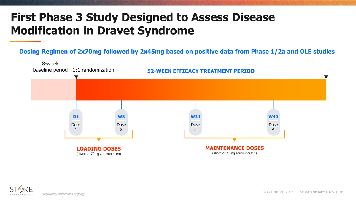 EMPEROR Phase 3 Study Overview Phase 3 design and dose regimen aligned with Ph1/2 and OLE studies Primary endpoint Key secondaries Study Design: Sham-controlled, 1:1 randomization Seizures Durability of effect on Dosing Regimen: 2x70mg + 2x45mg major motor seizure Percent change from Study Start: May 2025 frequency measured at baseline in major motor Week 52 Population: 2 to <18 years with a confirmed seizure frequency in variant in the SCN1A gene not associated with gain patients receiving Improvements in of function zorevunersen as behavior & cognition compared to sham measured by Vineland- Number of Patients Randomized: ~150 measured at Week 28 3 subdomains Sites: ~60 globally Other Endpoints Duration: 8-week baseline, 52-week efficacy treatment period Safety, CGI-C, CaGI-C, BSID-IV, and others Data Anticipated: 2H 2027 © COPYRIGHT 2025 | STOKE THERAPEUTICS | 17 Regulatory discussions ongoing