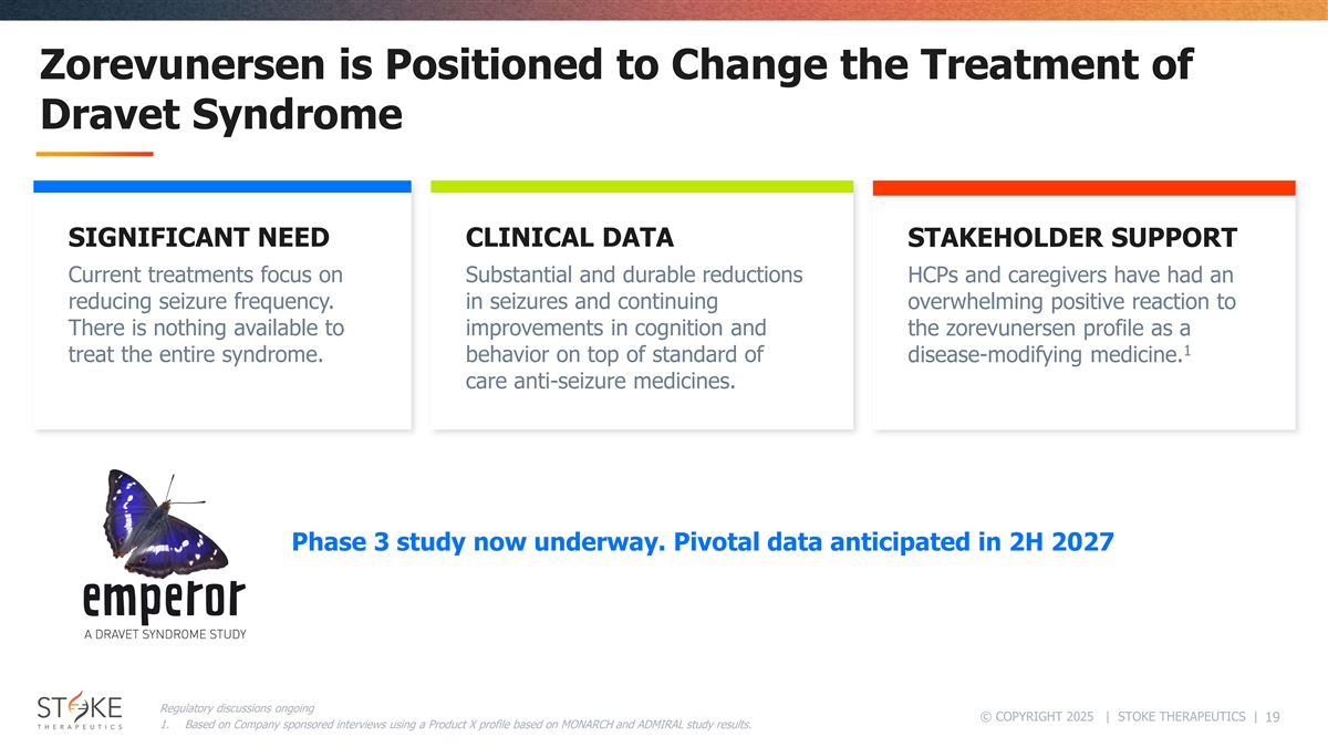 First Phase 3 Study Designed to Assess Disease Modification in Dravet Syndrome Dosing Regimen of 2x70mg followed by 2x45mg based on positive data from Phase 1/2a and OLE studies 8-week baseline period 1:1 randomization 52-WEEK EFFICACY TREATMENT PERIOD D1 W8 W24 W40 Dose Dose Dose Dose 1 2 3 4 MAINTENANCE DOSES LOADING DOSES (sham or 45mg zorevunersen) (sham or 70mg zorevunersen) © COPYRIGHT 2025 | STOKE THERAPEUTICS | 18 Regulatory discussions ongoing