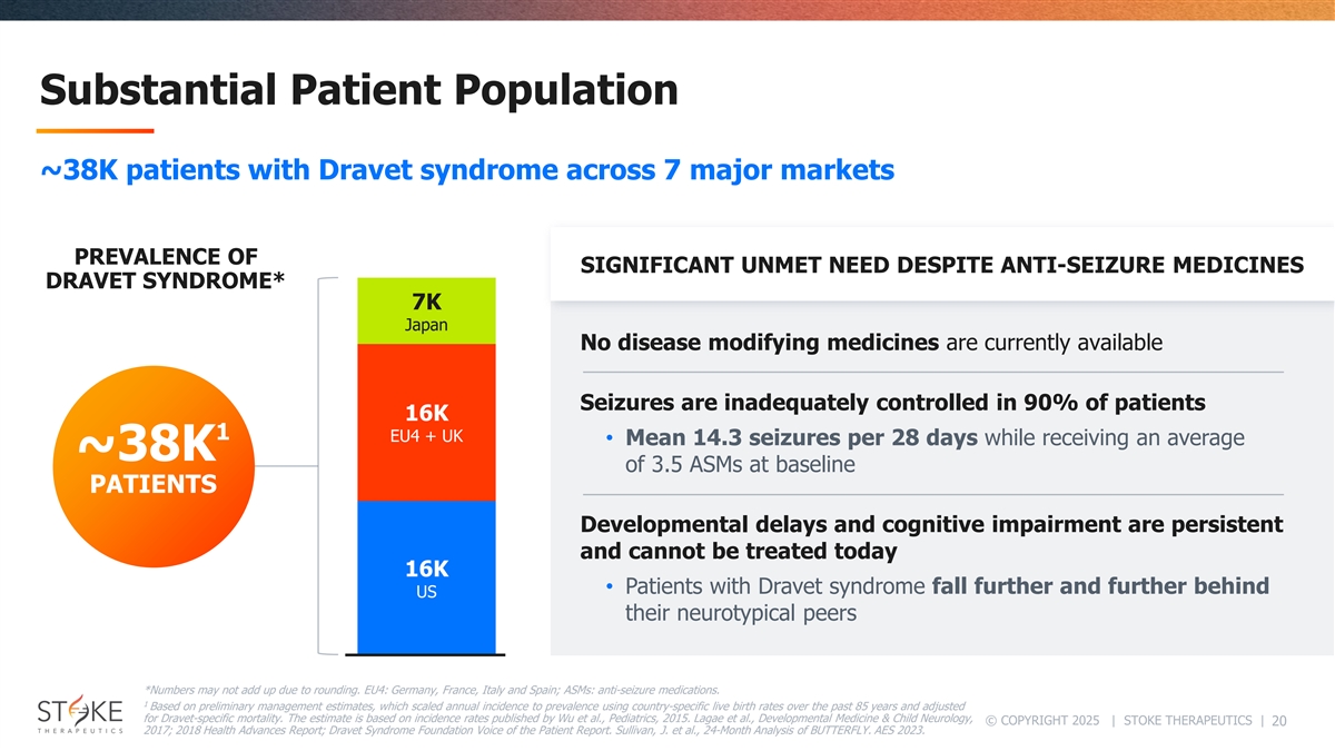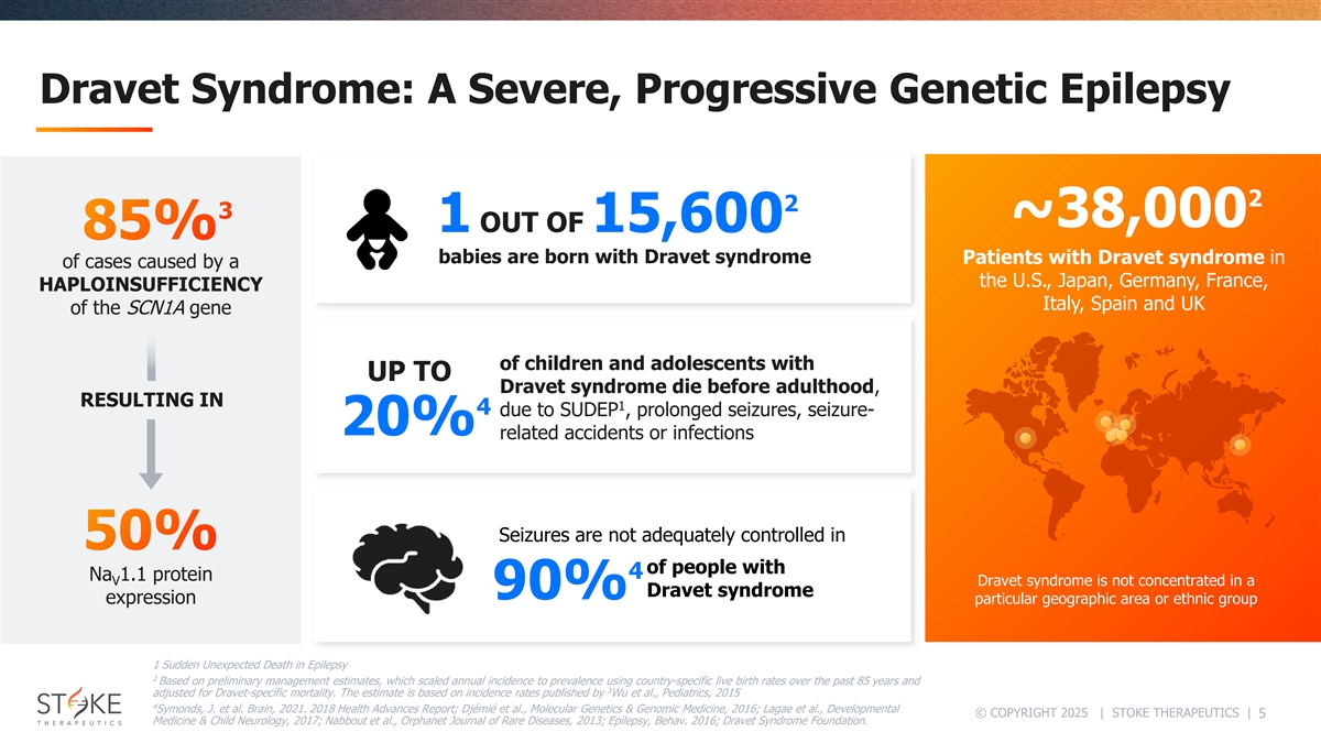Dravet Syndrome: A Severe, Progressive Genetic Epilepsy 2 2 ~38,000 1 OUT OF 15,600 babies are born with Dravet syndrome Patients with Dravet syndrome in of cases caused by a the U.S., Japan, Germany, France, HAPLOINSUFFICIENCY Italy, Spain and UK of the SCN1A gene of children and adolescents with UP TO Dravet syndrome die before adulthood, RESULTING IN 1 4 due to SUDEP , prolonged seizures, seizure- 20% related accidents or infections Seizures are not adequately controlled in of people with 4 Na 1.1 protein V Dravet syndrome is not concentrated in a Dravet syndrome 90% expression particular geographic area or ethnic group 1 Sudden Unexpected Death in Epilepsy 2 Based on preliminary management estimates, which scaled annual incidence to prevalence using country-specific live birth rates over the past 85 years and 3 adjusted for Dravet-specific mortality. The estimate is based on incidence rates published by Wu et al., Pediatrics, 2015 4 Symonds, J. et al. Brain, 2021. 2018 Health Advances Report; Djémié et al., Molecular Genetics & Genomic Medicine, 2016; Lagae et al., Developmental © COPYRIGHT 2025 | STOKE THERAPEUTICS | 5 Medicine & Child Neurology, 2017; Nabbout et al., Orphanet Journal of Rare Diseases, 2013; Epilepsy, Behav. 2016; Dravet Syndrome Foundation.