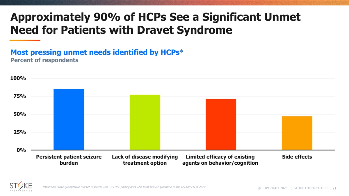 Approximately 90% of HCPs See a Significant Unmet Need for Patients with Dravet Syndrome Most pressing unmet needs identified by HCPs* Percent of respondents 100% 75% 50% 25% 0% Persistent patient seizure Lack of disease modifying Limited efficacy of existing Side effects burden treatment option agents on behavior/cognition *Based on Stoke quantitative market research with 135 HCP participants who treat Dravet syndrome in the US and EU in 2024. © COPYRIGHT 2025 | STOKE THERAPEUTICS | 21