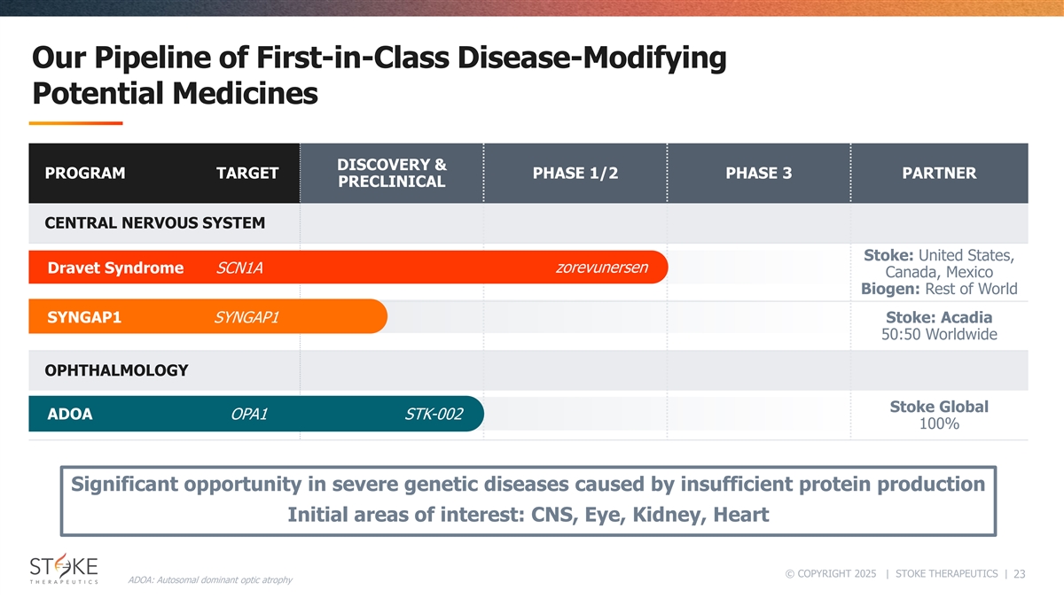 Our Pipeline of First-in-Class Disease-Modifying Potential Medicines DISCOVERY & PROGRAM TARGET PHASE 1/2 PHASE 3 PARTNER PRECLINICAL CENTRAL NERVOUS SYSTEM Stoke: United States, zorevunersen Dravet Syndrome SCN1A Canada, Mexico Biogen: Rest of World SYNGAP1 SYNGAP1 Stoke: Acadia 50:50 Worldwide OPHTHALMOLOGY Stoke Global ADOA OPA1 STK-002 100% Significant opportunity in severe genetic diseases caused by insufficient protein production Initial areas of interest: CNS, Eye, Kidney, Heart © COPYRIGHT 2025 | STOKE THERAPEUTICS | 23 ADOA: Autosomal dominant optic atrophy