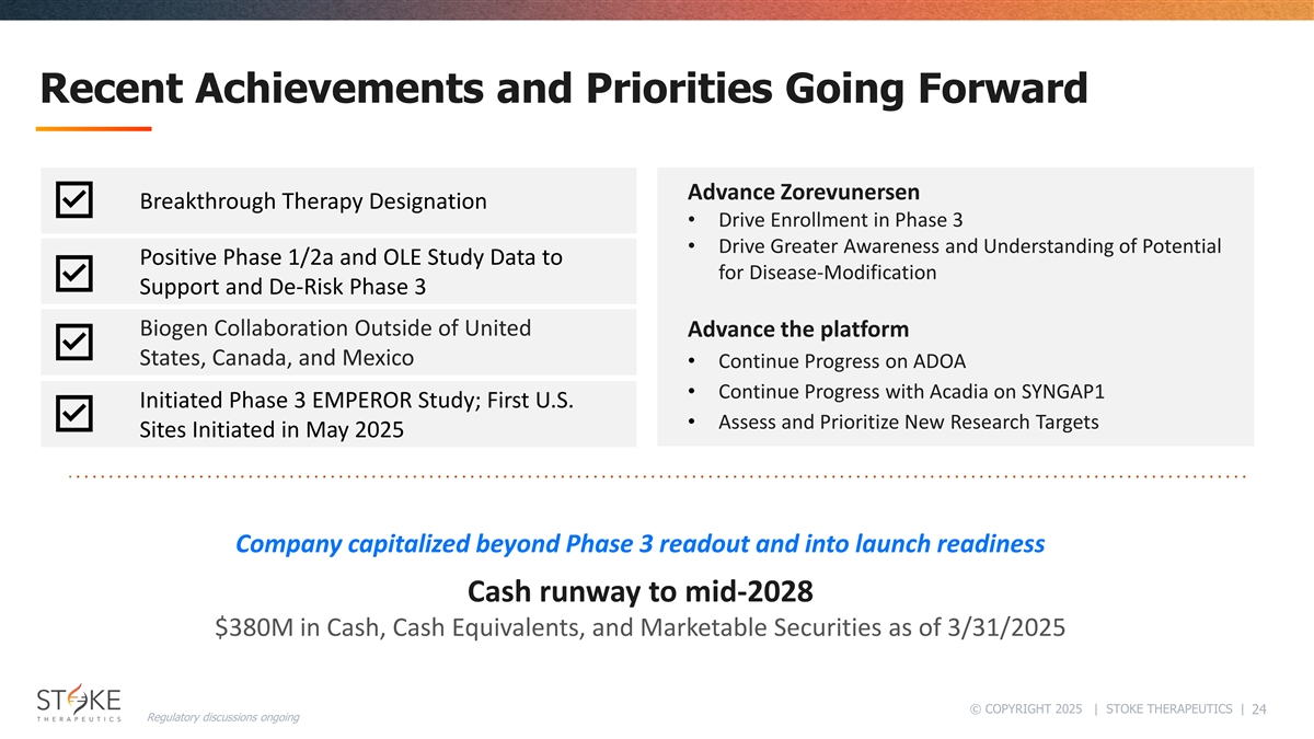 Recent Achievements and Priorities Going Forward Advance Zorevunersen Breakthrough Therapy Designation • Drive Enrollment in Phase 3 • Drive Greater Awareness and Understanding of Potential Positive Phase 1/2a and OLE Study Data to for Disease-Modification Support and De-Risk Phase 3 Biogen Collaboration Outside of United Advance the platform States, Canada, and Mexico • Continue Progress on ADOA • Continue Progress with Acadia on SYNGAP1 Initiated Phase 3 EMPEROR Study; First U.S. • Assess and Prioritize New Research Targets Sites Initiated in May 2025 Company capitalized beyond Phase 3 readout and into launch readiness Cash runway to mid-2028 $380M in Cash, Cash Equivalents, and Marketable Securities as of 3/31/2025 © COPYRIGHT 2025 | STOKE THERAPEUTICS | 24 Regulatory discussions ongoing