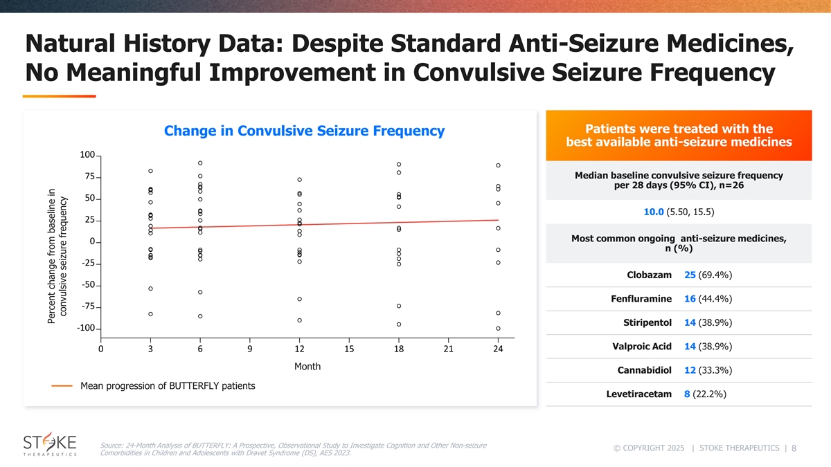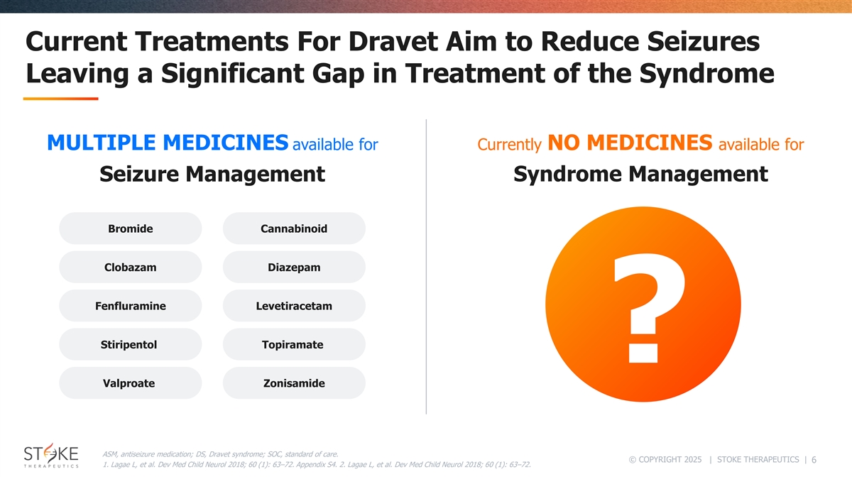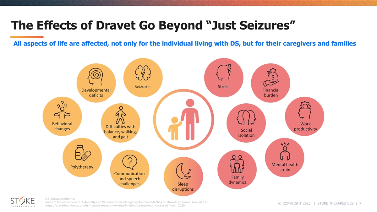 Current Treatments For Dravet Aim to Reduce Seizures Leaving a Significant Gap in Treatment of the Syndrome MULTIPLE MEDICINES available for Currently NO MEDICINES available for Seizure Management Syndrome Management Bromide Cannabinoid Clobazam Diazepam Fenfluramine Levetiracetam Stiripentol Topiramate ? Valproate Zonisamide ASM, antiseizure medication; DS, Dravet syndrome; SOC, standard of care. © COPYRIGHT 2025 | STOKE THERAPEUTICS | 6 1. Lagae L, et al. Dev Med Child Neurol 2018; 60 (1): 63–72. Appendix S4. 2. Lagae L, et al. Dev Med Child Neurol 2018; 60 (1): 63–72.