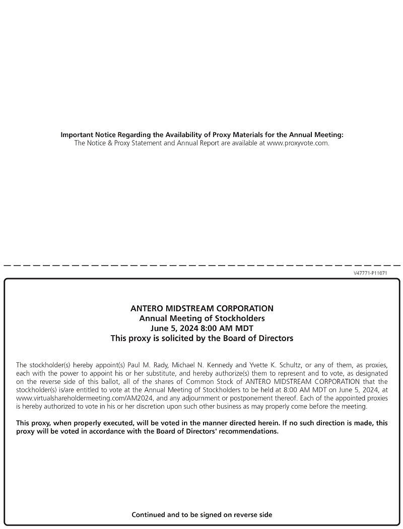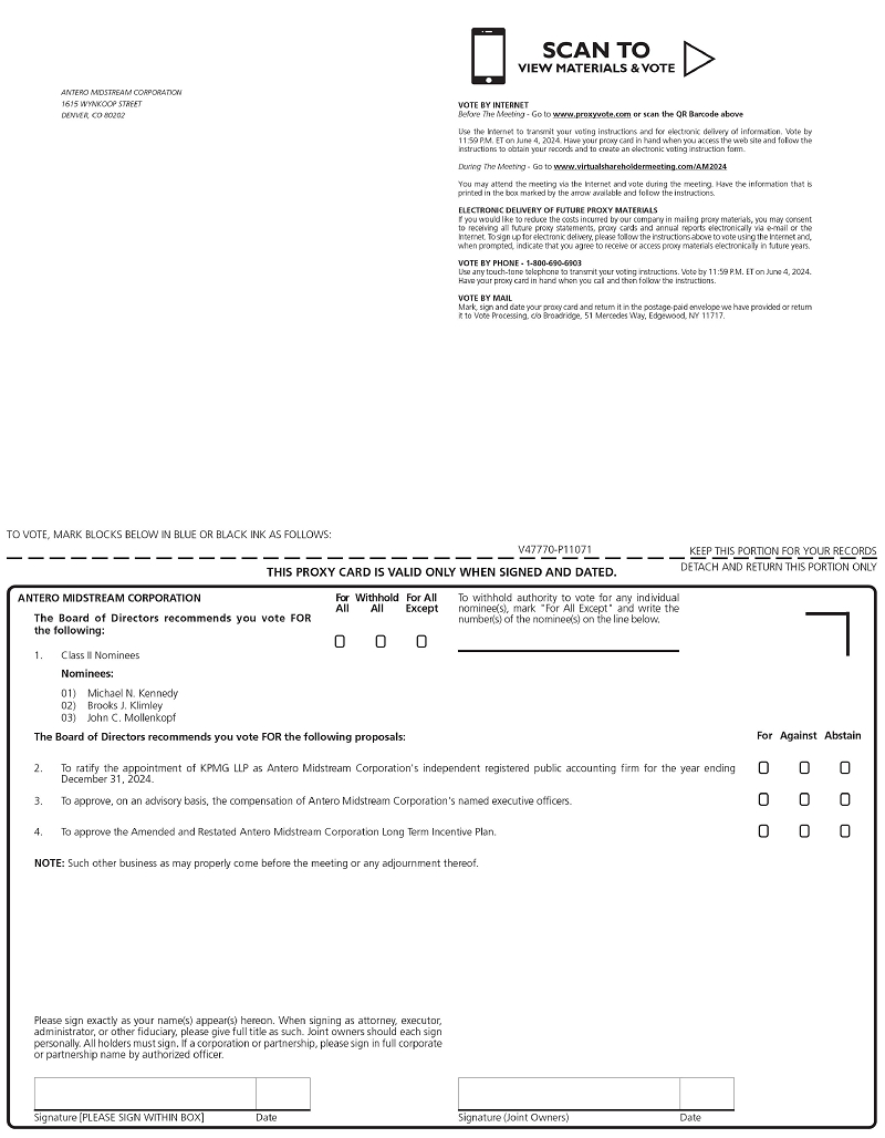 | 1. | Elect the three Class II members of Antero Midstream Corporation’s Board of Directors (the “Board”) named in this Proxy Statement to serve until Antero Midstream’s 2027 Annual Meeting of Stockholders, |