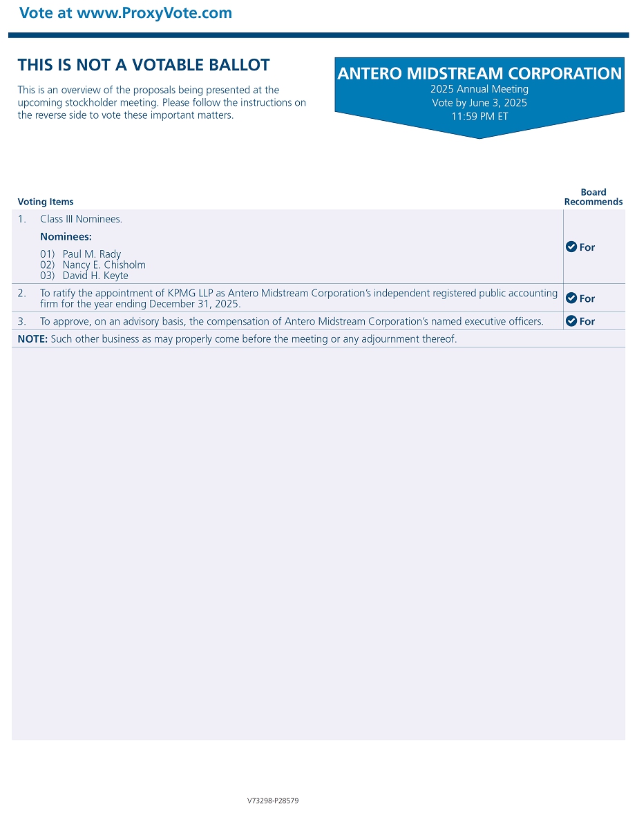 Vote at www.ProxyVote.com THIS IS NOT A VOTABLE BALLOT This is an overview of the proposals being presented at the upcoming stockholder meeting. Please follow the instructions on the reverse side to vote these important matters. Voting Items Board Recommends ANTERO MIDSTREAM CORPORATION 2025 Annual Meeting Vote by June 3, 2025 11:59 PM ET 1. Class III Nominees. For Nominees: 01) Paul M. Rady 02) Nancy E. Chisholm 03) David H. Keyte 2. To ratify the appointment of KPMG LLP as Antero Midstream Corporation's independent registered public accountingfirm for the year ending December 31, 2025. For 3. To approve, on an advisory basis, the compensation of Antero Midstream Corporation's named executive officers. For NOTE: Such other business as may properly come before the meeting or any adjournment thereof. V73298-P28579