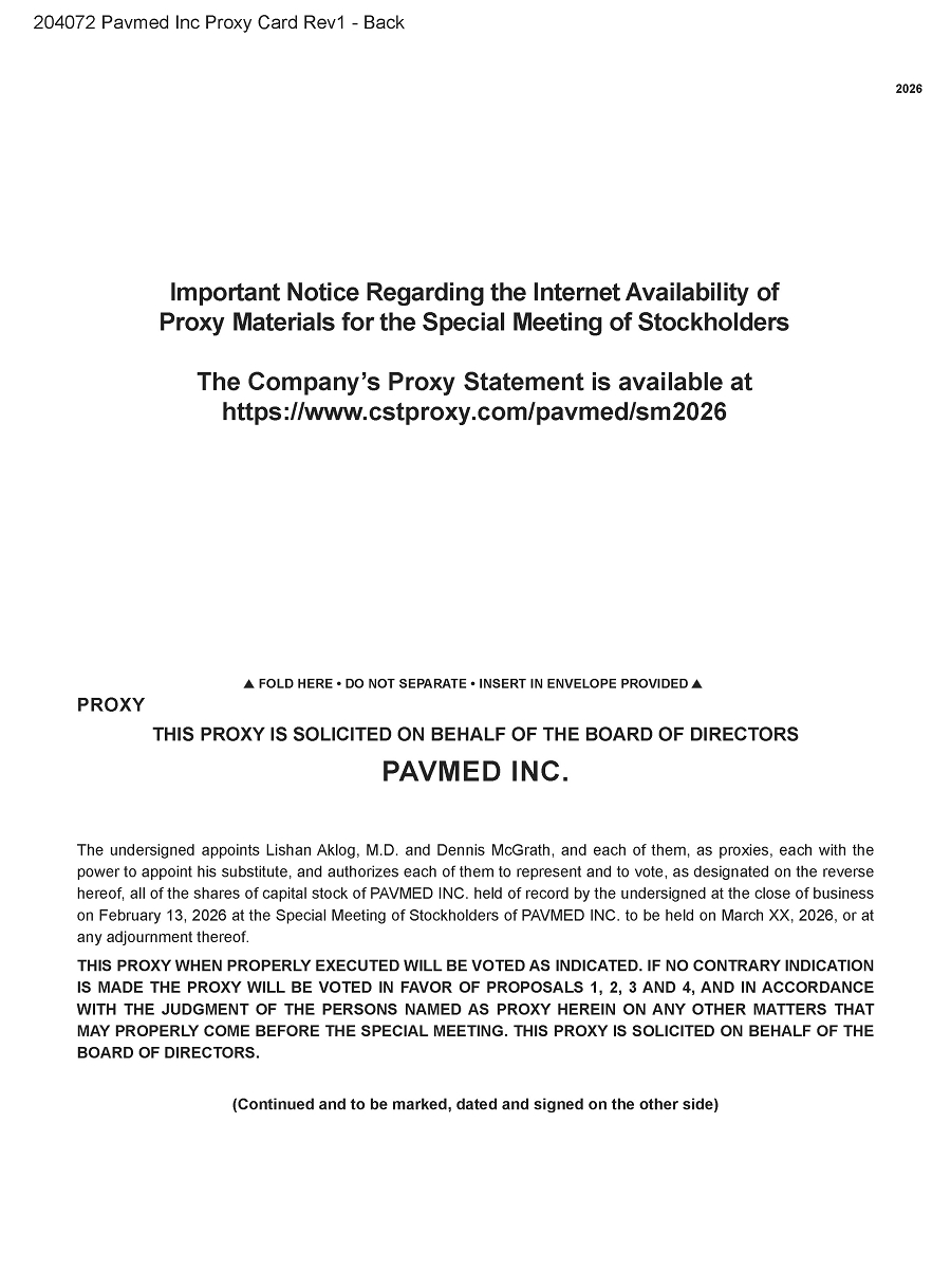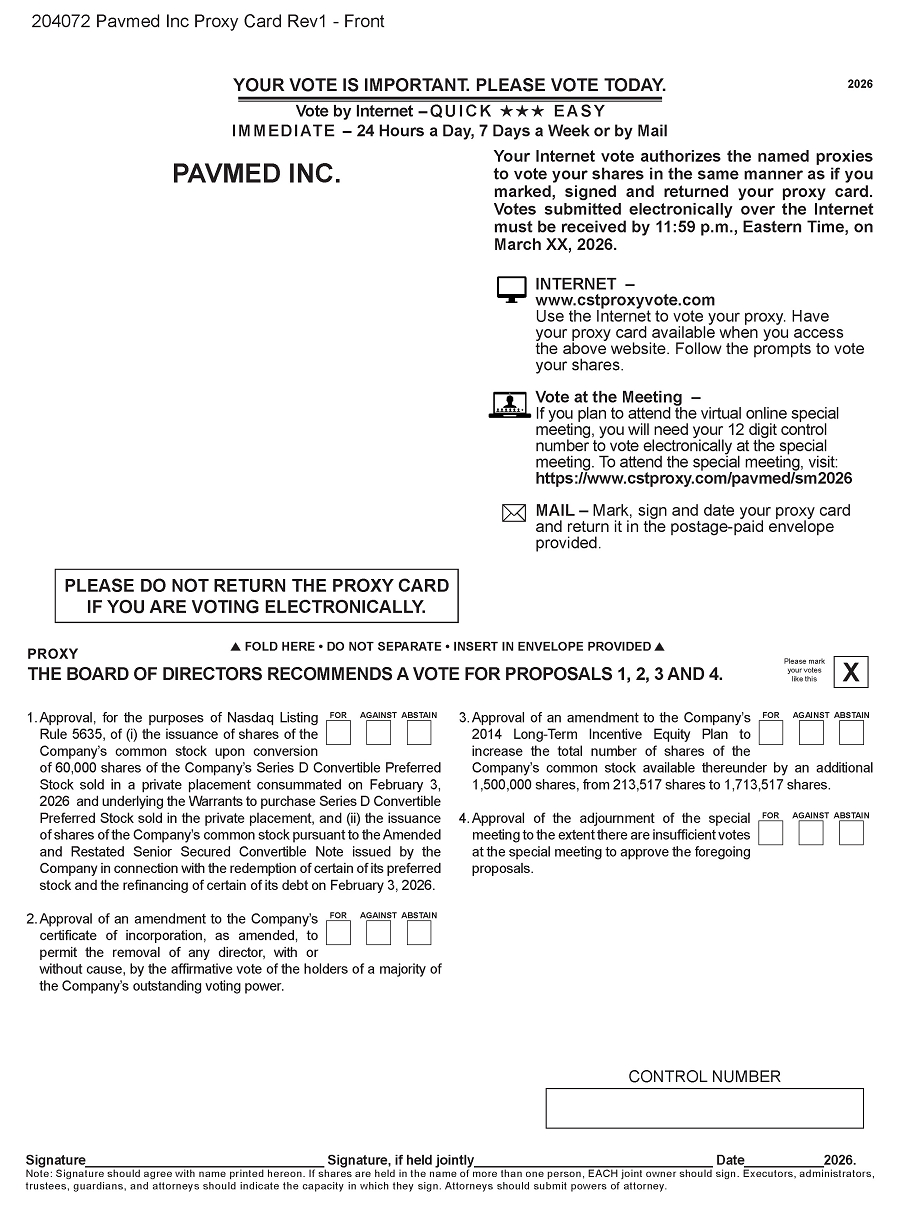 NOTICE IS HEREBY GIVEN that a special meeting of stockholders (the “Special Meeting”) of PAVmed Inc., a Delaware corporation (the “Company”), will be held on March [●], 2026 at 10:00 a.m., Eastern time. The Special Meeting will be a virtual meeting. You will be able to attend and participate in the Special Meeting online by visiting https://www.cstproxy.com/pavmed/sm2026. Please see the “Questions and Answers” in the accompanying proxy statement for more details.