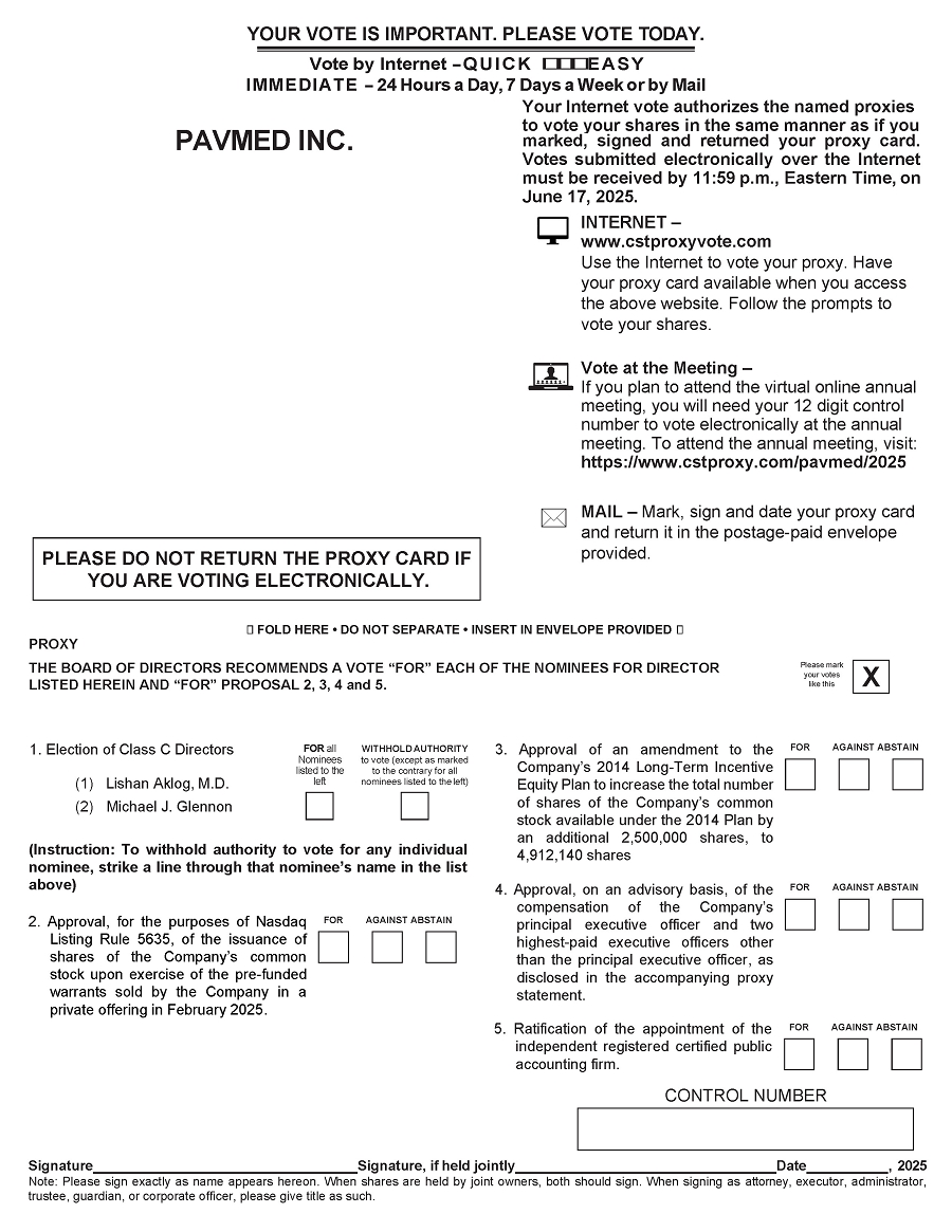 Important Notice Regarding the Availability of Proxy Materials for the Annual Meeting of Stockholders to be Held on June 18, 2025: The Company’s Proxy Statement and Annual Report are available at http://www.cstproxy.com/pavmed/2025. |