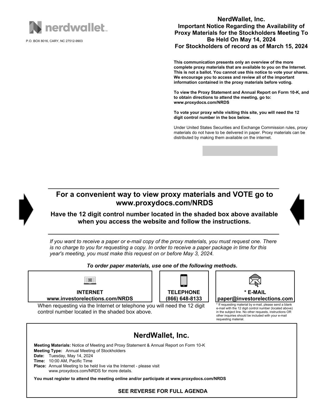 NerdWallet, Inc. Important Notice Regarding the Availability of Proxy Materials for the Stockholders Meeting To Be Held On May 14, 2024 For Stockholders of record as of March 15, 2024 Have the 12 digit control number located in the shaded box above available when you access the website and follow the instructions. When requesting via the Internet or telephone you will need the 12 digit control number located in the shaded box above. * If requesting material by e-mail, please send a blank e-mail with the 12 digit control number (located above) in the subject line. No other requests, instructions OR other inquiries should be included with your e-mail requesting material. NerdWallet, Inc. Meeting Type: Date: Time: Place: Annual Meeting of Stockholders Tuesday, May 14, 2024 10:00 AM, Pacific Time Annual Meeting to be held live via the Internet - please visit www.proxydocs.com/NRDS for more details. You must register to attend the meeting online and/or participate at www.proxydocs.com/NRDS SEE REVERSE FOR FULL AGENDA INTERNET www.investorelections.com/NRDS TELEPHONE (866) 648-8133 * E-MAIL paper@investorelections.com To order paper materials, use one of the following methods. For a convenient way to view proxy materials and VOTE go to www.proxydocs.com/NRDS If you want to receive a paper or e-mail copy of the proxy materials, you must request one. There is no charge to you for requesting a copy. In order to receive a paper package in time for this year's meeting, you must make this request on or before May 3, 2024. This communication presents only an overview of the more complete proxy materials that are available to you on the Internet. This is not a ballot. You cannot use this notice to vote your shares. We encourage you to access and review all of the important information contained in the proxy materials before voting. To view the Proxy Statement and Annual Report on Form 10-K, and to obtain directions to attend the meeting, go to: www.proxydocs.com/NRDS To vote your proxy while visiting this site, you will need the 12 digit control number in the box below. Under United States Securities and Exchange Commission rules, proxy materials do not have to be delivered in paper. Proxy materials can be distributed by making them available on the internet. P.O. BOX 8016, CARY, NC 27512-9903 Meeting Materials: Notice of Meeting and Proxy Statement & Annual Report on Form 10-K