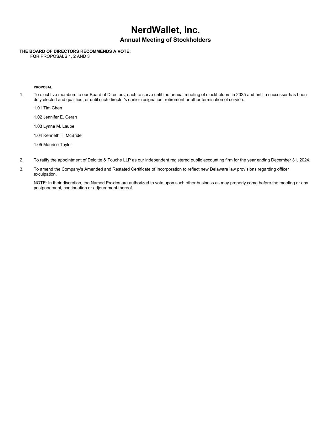 NerdWallet, Inc. Annual Meeting of Stockholders PROPOSAL 1. To elect five members to our Board of Directors, each to serve until the annual meeting of stockholders in 2025 and until a successor has been duly elected and qualified, or until such director's earlier resignation, retirement or other termination of service. 1.01 Tim Chen 1.02 Jennifer E. Ceran 1.03 Lynne M. Laube 1.04 Kenneth T. McBride 1.05 Maurice Taylor 2. To ratify the appointment of Deloitte & Touche LLP as our independent registered public accounting firm for the year ending December 31, 2024. 3. To amend the Company's Amended and Restated Certificate of Incorporation to reflect new Delaware law provisions regarding officer exculpation. NOTE: In their discretion, the Named Proxies are authorized to vote upon such other business as may properly come before the meeting or any postponement, continuation or adjournment thereof. THE BOARD OF DIRECTORS RECOMMENDS A VOTE: FOR PROPOSALS 1, 2 AND 3