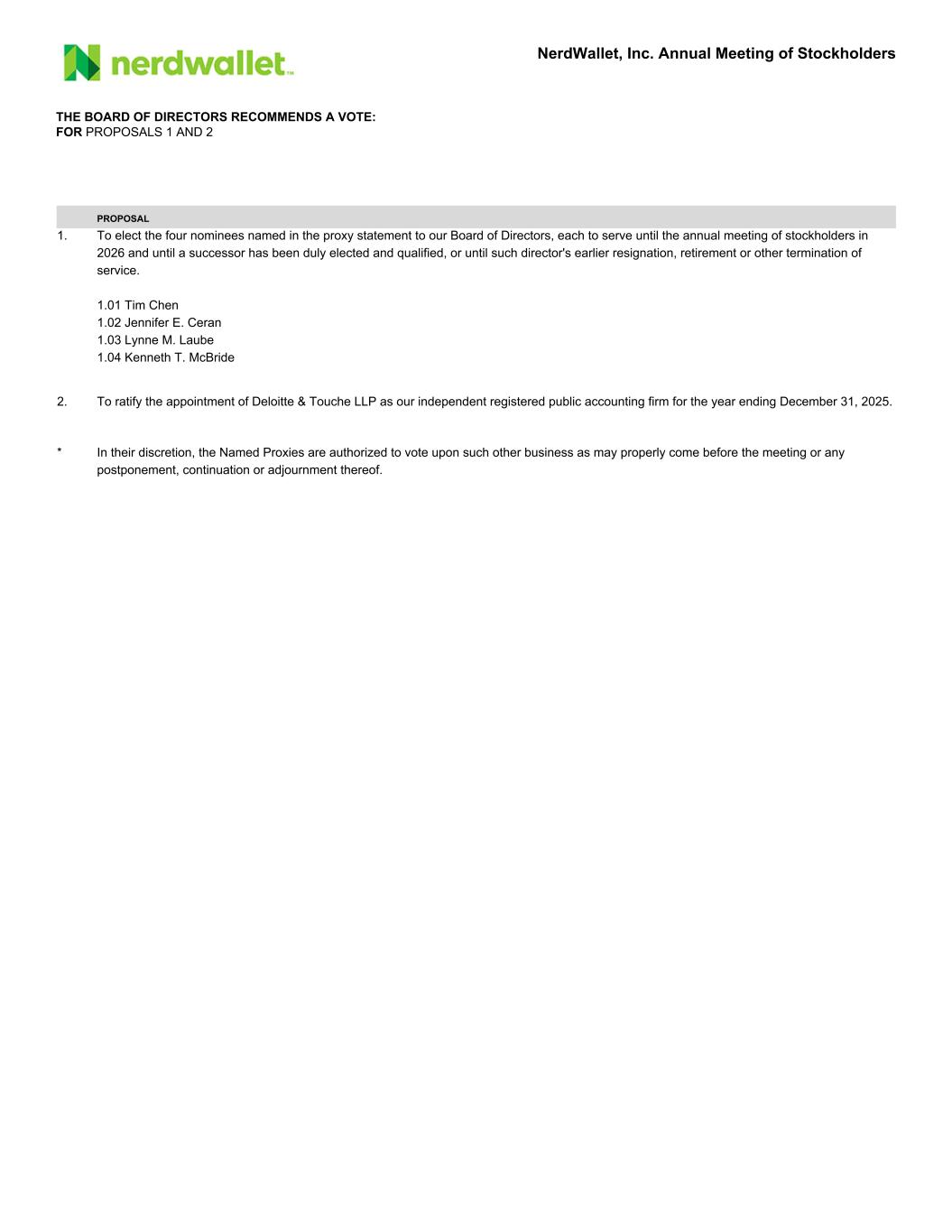 PROPOSAL 1. To elect the four nominees named in the proxy statement to our Board of Directors, each to serve until the annual meeting of stockholders in 2026 and until a successor has been duly elected and qualified, or until such director's earlier resignation, retirement or other termination of service. 1.01 Tim Chen 1.02 Jennifer E. Ceran 1.03 Lynne M. Laube 1.04 Kenneth T. McBride 2. To ratify the appointment of Deloitte & Touche LLP as our independent registered public accounting firm for the year ending December 31, 2025. * In their discretion, the Named Proxies are authorized to vote upon such other business as may properly come before the meeting or any postponement, continuation or adjournment thereof. THE BOARD OF DIRECTORS RECOMMENDS A VOTE: FOR PROPOSALS 1 AND 2 NerdWallet, Inc. Annual Meeting of Stockholders