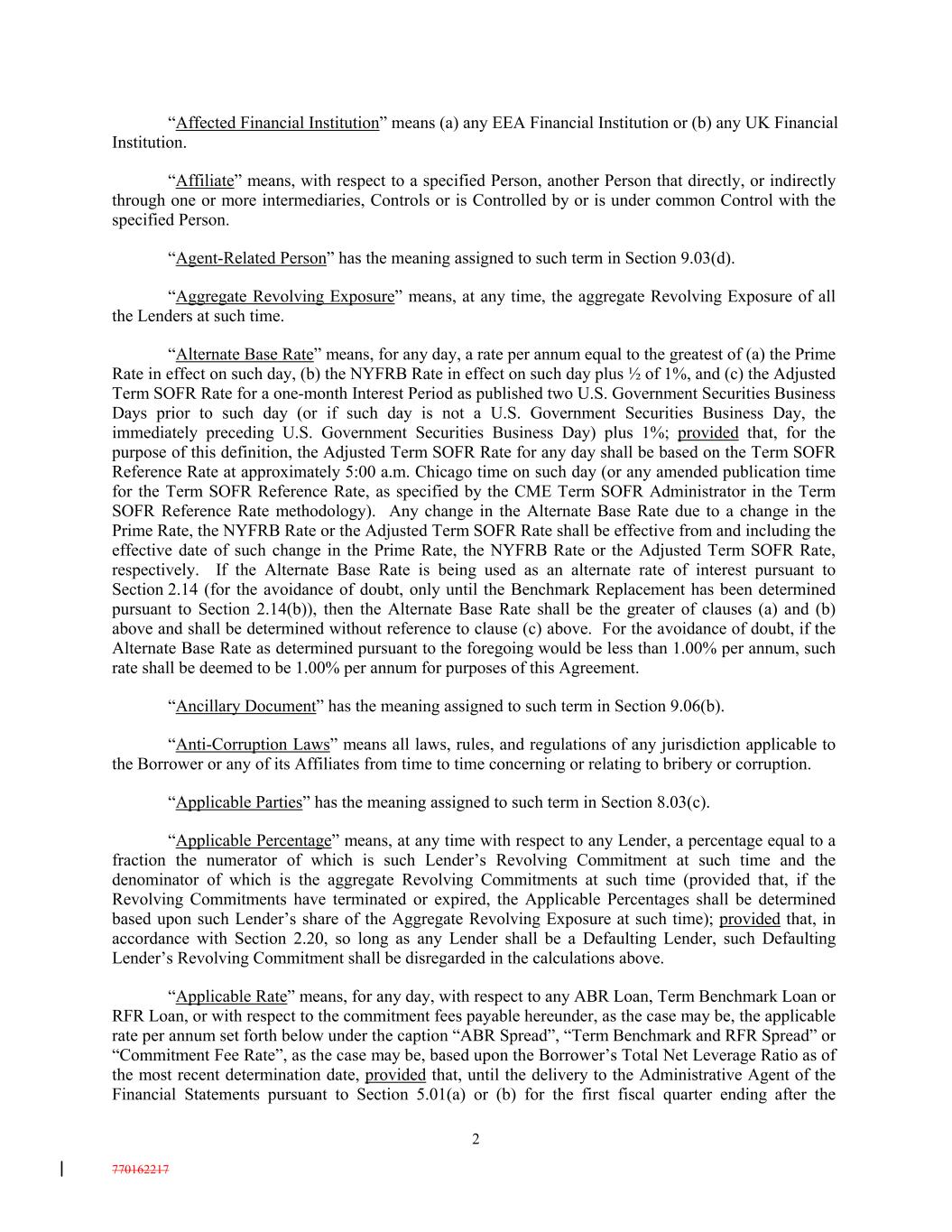 “Affected Financial Institution” means (a) any EEA Financial Institution or (b) any UK Financial Institution. “Affiliate” means, with respect to a specified Person, another Person that directly, or indirectly through one or more intermediaries, Controls or is Controlled by or is under common Control with the specified Person. “Agent-Related Person” has the meaning assigned to such term in Section 9.03(d). “Aggregate Revolving Exposure” means, at any time, the aggregate Revolving Exposure of all the Lenders at such time. “Alternate Base Rate” means, for any day, a rate per annum equal to the greatest of (a) the Prime Rate in effect on such day, (b) the NYFRB Rate in effect on such day plus ½ of 1%, and (c) the Adjusted Term SOFR Rate for a one-month Interest Period as published two U.S. Government Securities Business Days prior to such day (or if such day is not a U.S. Government Securities Business Day, the immediately preceding U.S. Government Securities Business Day) plus 1%; provided that, for the purpose of this definition, the Adjusted Term SOFR Rate for any day shall be based on the Term SOFR Reference Rate at approximately 5:00 a.m. Chicago time on such day (or any amended publication time for the Term SOFR Reference Rate, as specified by the CME Term SOFR Administrator in the Term SOFR Reference Rate methodology). Any change in the Alternate Base Rate due to a change in the Prime Rate, the NYFRB Rate or the Adjusted Term SOFR Rate shall be effective from and including the effective date of such change in the Prime Rate, the NYFRB Rate or the Adjusted Term SOFR Rate, respectively. If the Alternate Base Rate is being used as an alternate rate of interest pursuant to Section 2.14 (for the avoidance of doubt, only until the Benchmark Replacement has been determined pursuant to Section 2.14(b)), then the Alternate Base Rate shall be the greater of clauses (a) and (b) above and shall be determined without reference to clause (c) above. For the avoidance of doubt, if the Alternate Base Rate as determined pursuant to the foregoing would be less than 1.00% per annum, such rate shall be deemed to be 1.00% per annum for purposes of this Agreement. “Ancillary Document” has the meaning assigned to such term in Section 9.06(b). “Anti-Corruption Laws” means all laws, rules, and regulations of any jurisdiction applicable to the Borrower or any of its Affiliates from time to time concerning or relating to bribery or corruption. “Applicable Parties” has the meaning assigned to such term in Section 8.03(c). “Applicable Percentage” means, at any time with respect to any Lender, a percentage equal to a fraction the numerator of which is such Lender’s Revolving Commitment at such time and the denominator of which is the aggregate Revolving Commitments at such time (provided that, if the Revolving Commitments have terminated or expired, the Applicable Percentages shall be determined based upon such Lender’s share of the Aggregate Revolving Exposure at such time); provided that, in accordance with Section 2.20, so long as any Lender shall be a Defaulting Lender, such Defaulting Lender’s Revolving Commitment shall be disregarded in the calculations above. “Applicable Rate” means, for any day, with respect to any ABR Loan, Term Benchmark Loan or RFR Loan, or with respect to the commitment fees payable hereunder, as the case may be, the applicable rate per annum set forth below under the caption “ABR Spread”, “Term Benchmark and RFR Spread” or “Commitment Fee Rate”, as the case may be, based upon the Borrower’s Total Net Leverage Ratio as of the most recent determination date, provided that, until the delivery to the Administrative Agent of the Financial Statements pursuant to Section 5.01(a) or (b) for the first fiscal quarter ending after the 2 770162217