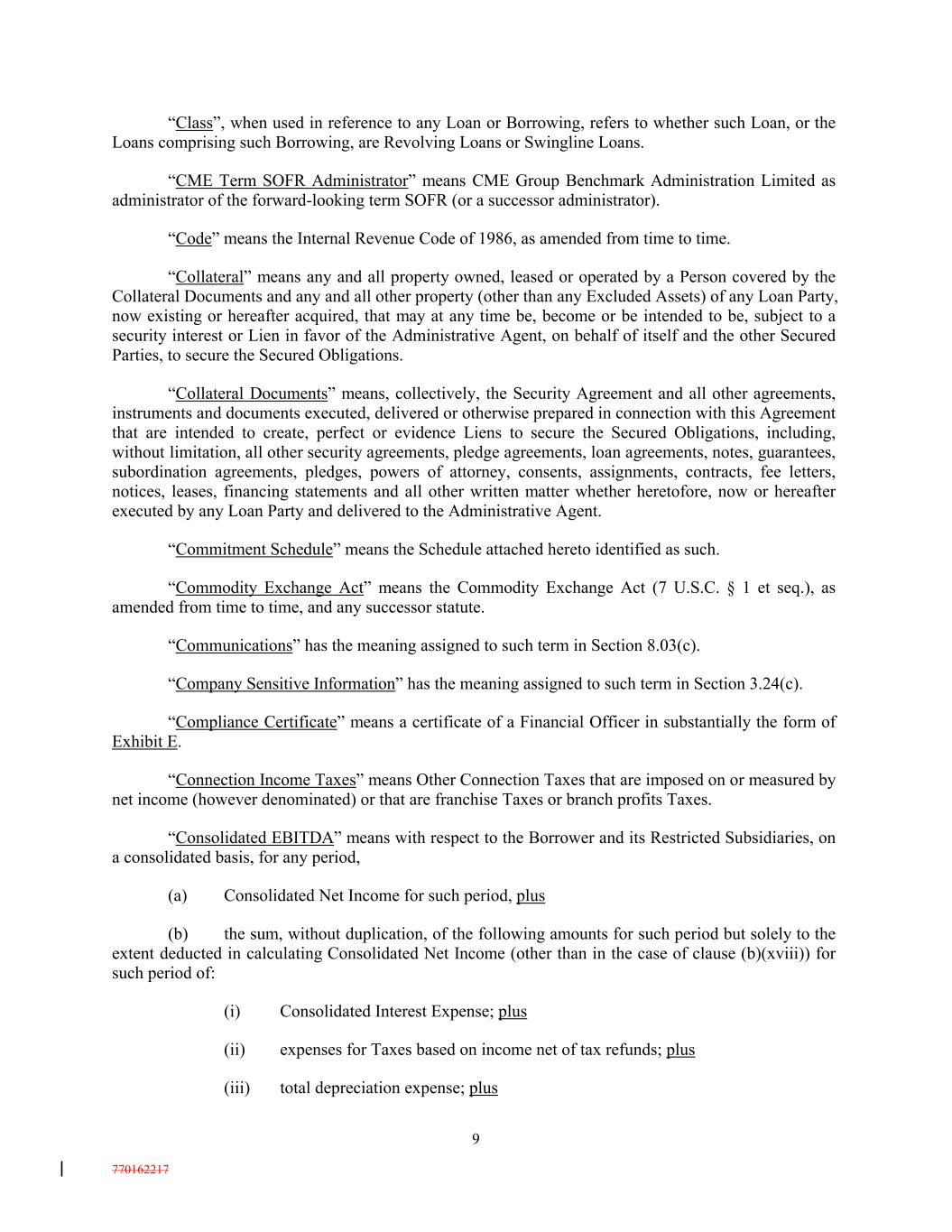 “Class”, when used in reference to any Loan or Borrowing, refers to whether such Loan, or the Loans comprising such Borrowing, are Revolving Loans or Swingline Loans. “CME Term SOFR Administrator” means CME Group Benchmark Administration Limited as administrator of the forward-looking term SOFR (or a successor administrator). “Code” means the Internal Revenue Code of 1986, as amended from time to time. “Collateral” means any and all property owned, leased or operated by a Person covered by the Collateral Documents and any and all other property (other than any Excluded Assets) of any Loan Party, now existing or hereafter acquired, that may at any time be, become or be intended to be, subject to a security interest or Lien in favor of the Administrative Agent, on behalf of itself and the other Secured Parties, to secure the Secured Obligations. “Collateral Documents” means, collectively, the Security Agreement and all other agreements, instruments and documents executed, delivered or otherwise prepared in connection with this Agreement that are intended to create, perfect or evidence Liens to secure the Secured Obligations, including, without limitation, all other security agreements, pledge agreements, loan agreements, notes, guarantees, subordination agreements, pledges, powers of attorney, consents, assignments, contracts, fee letters, notices, leases, financing statements and all other written matter whether heretofore, now or hereafter executed by any Loan Party and delivered to the Administrative Agent. “Commitment Schedule” means the Schedule attached hereto identified as such. “Commodity Exchange Act” means the Commodity Exchange Act (7 U.S.C. § 1 et seq.), as amended from time to time, and any successor statute. “Communications” has the meaning assigned to such term in Section 8.03(c). “Company Sensitive Information” has the meaning assigned to such term in Section 3.24(c). “Compliance Certificate” means a certificate of a Financial Officer in substantially the form of Exhibit E. “Connection Income Taxes” means Other Connection Taxes that are imposed on or measured by net income (however denominated) or that are franchise Taxes or branch profits Taxes. “Consolidated EBITDA” means with respect to the Borrower and its Restricted Subsidiaries, on a consolidated basis, for any period, (a) Consolidated Net Income for such period, plus (b) the sum, without duplication, of the following amounts for such period but solely to the extent deducted in calculating Consolidated Net Income (other than in the case of clause (b)(xviii)) for such period of: (i) Consolidated Interest Expense; plus (ii) expenses for Taxes based on income net of tax refunds; plus (iii) total depreciation expense; plus 9 770162217