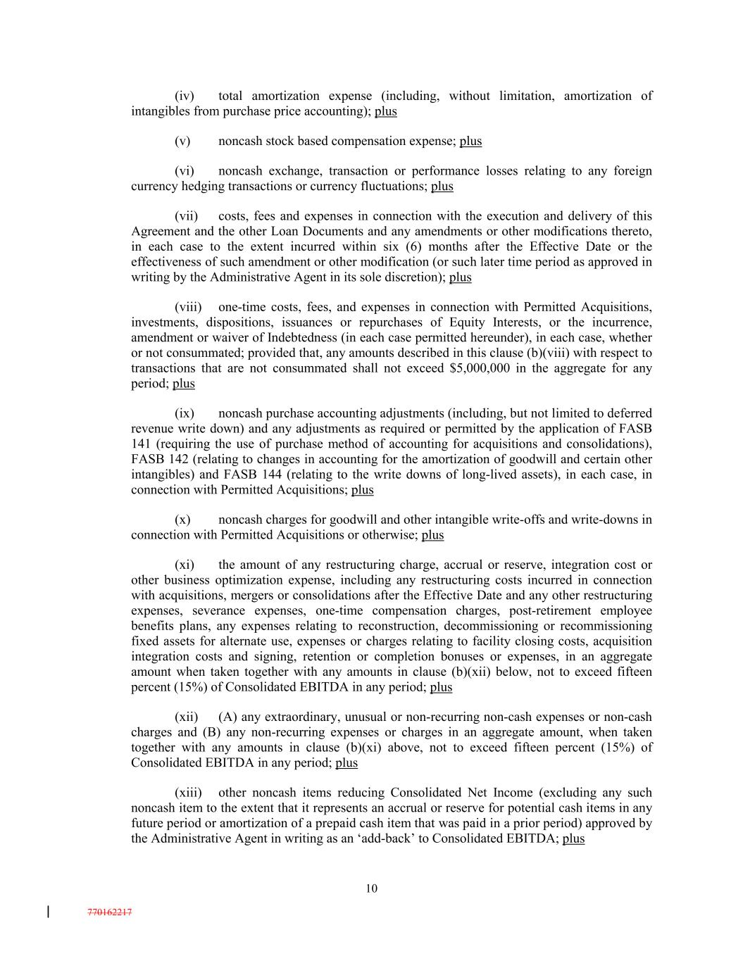 (iv) total amortization expense (including, without limitation, amortization of intangibles from purchase price accounting); plus (v) noncash stock based compensation expense; plus (vi) noncash exchange, transaction or performance losses relating to any foreign currency hedging transactions or currency fluctuations; plus (vii) costs, fees and expenses in connection with the execution and delivery of this Agreement and the other Loan Documents and any amendments or other modifications thereto, in each case to the extent incurred within six (6) months after the Effective Date or the effectiveness of such amendment or other modification (or such later time period as approved in writing by the Administrative Agent in its sole discretion); plus (viii) one-time costs, fees, and expenses in connection with Permitted Acquisitions, investments, dispositions, issuances or repurchases of Equity Interests, or the incurrence, amendment or waiver of Indebtedness (in each case permitted hereunder), in each case, whether or not consummated; provided that, any amounts described in this clause (b)(viii) with respect to transactions that are not consummated shall not exceed $5,000,000 in the aggregate for any period; plus (ix) noncash purchase accounting adjustments (including, but not limited to deferred revenue write down) and any adjustments as required or permitted by the application of FASB 141 (requiring the use of purchase method of accounting for acquisitions and consolidations), FASB 142 (relating to changes in accounting for the amortization of goodwill and certain other intangibles) and FASB 144 (relating to the write downs of long-lived assets), in each case, in connection with Permitted Acquisitions; plus (x) noncash charges for goodwill and other intangible write-offs and write-downs in connection with Permitted Acquisitions or otherwise; plus (xi) the amount of any restructuring charge, accrual or reserve, integration cost or other business optimization expense, including any restructuring costs incurred in connection with acquisitions, mergers or consolidations after the Effective Date and any other restructuring expenses, severance expenses, one-time compensation charges, post-retirement employee benefits plans, any expenses relating to reconstruction, decommissioning or recommissioning fixed assets for alternate use, expenses or charges relating to facility closing costs, acquisition integration costs and signing, retention or completion bonuses or expenses, in an aggregate amount when taken together with any amounts in clause (b)(xii) below, not to exceed fifteen percent (15%) of Consolidated EBITDA in any period; plus (xii) (A) any extraordinary, unusual or non-recurring non-cash expenses or non-cash charges and (B) any non-recurring expenses or charges in an aggregate amount, when taken together with any amounts in clause (b)(xi) above, not to exceed fifteen percent (15%) of Consolidated EBITDA in any period; plus (xiii) other noncash items reducing Consolidated Net Income (excluding any such noncash item to the extent that it represents an accrual or reserve for potential cash items in any future period or amortization of a prepaid cash item that was paid in a prior period) approved by the Administrative Agent in writing as an ‘add-back’ to Consolidated EBITDA; plus 10 770162217