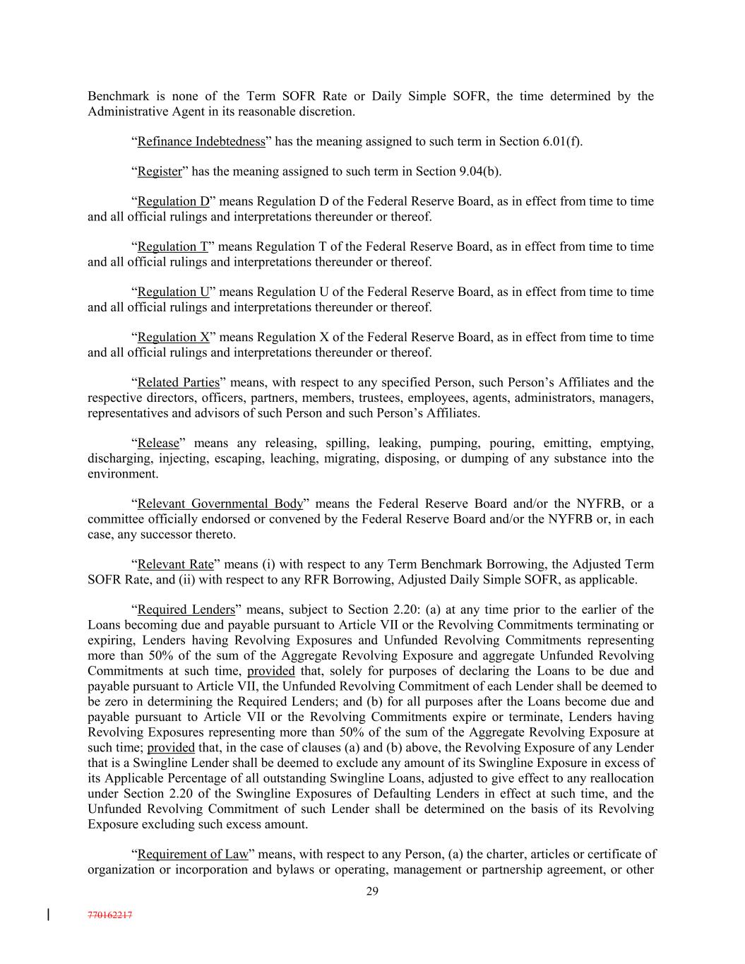 Benchmark is none of the Term SOFR Rate or Daily Simple SOFR, the time determined by the Administrative Agent in its reasonable discretion. “Refinance Indebtedness” has the meaning assigned to such term in Section 6.01(f). “Register” has the meaning assigned to such term in Section 9.04(b). “Regulation D” means Regulation D of the Federal Reserve Board, as in effect from time to time and all official rulings and interpretations thereunder or thereof. “Regulation T” means Regulation T of the Federal Reserve Board, as in effect from time to time and all official rulings and interpretations thereunder or thereof. “Regulation U” means Regulation U of the Federal Reserve Board, as in effect from time to time and all official rulings and interpretations thereunder or thereof. “Regulation X” means Regulation X of the Federal Reserve Board, as in effect from time to time and all official rulings and interpretations thereunder or thereof. “Related Parties” means, with respect to any specified Person, such Person’s Affiliates and the respective directors, officers, partners, members, trustees, employees, agents, administrators, managers, representatives and advisors of such Person and such Person’s Affiliates. “Release” means any releasing, spilling, leaking, pumping, pouring, emitting, emptying, discharging, injecting, escaping, leaching, migrating, disposing, or dumping of any substance into the environment. “Relevant Governmental Body” means the Federal Reserve Board and/or the NYFRB, or a committee officially endorsed or convened by the Federal Reserve Board and/or the NYFRB or, in each case, any successor thereto. “Relevant Rate” means (i) with respect to any Term Benchmark Borrowing, the Adjusted Term SOFR Rate, and (ii) with respect to any RFR Borrowing, Adjusted Daily Simple SOFR, as applicable. “Required Lenders” means, subject to Section 2.20: (a) at any time prior to the earlier of the Loans becoming due and payable pursuant to Article VII or the Revolving Commitments terminating or expiring, Lenders having Revolving Exposures and Unfunded Revolving Commitments representing more than 50% of the sum of the Aggregate Revolving Exposure and aggregate Unfunded Revolving Commitments at such time, provided that, solely for purposes of declaring the Loans to be due and payable pursuant to Article VII, the Unfunded Revolving Commitment of each Lender shall be deemed to be zero in determining the Required Lenders; and (b) for all purposes after the Loans become due and payable pursuant to Article VII or the Revolving Commitments expire or terminate, Lenders having Revolving Exposures representing more than 50% of the sum of the Aggregate Revolving Exposure at such time; provided that, in the case of clauses (a) and (b) above, the Revolving Exposure of any Lender that is a Swingline Lender shall be deemed to exclude any amount of its Swingline Exposure in excess of its Applicable Percentage of all outstanding Swingline Loans, adjusted to give effect to any reallocation under Section 2.20 of the Swingline Exposures of Defaulting Lenders in effect at such time, and the Unfunded Revolving Commitment of such Lender shall be determined on the basis of its Revolving Exposure excluding such excess amount. “Requirement of Law” means, with respect to any Person, (a) the charter, articles or certificate of organization or incorporation and bylaws or operating, management or partnership agreement, or other 29 770162217