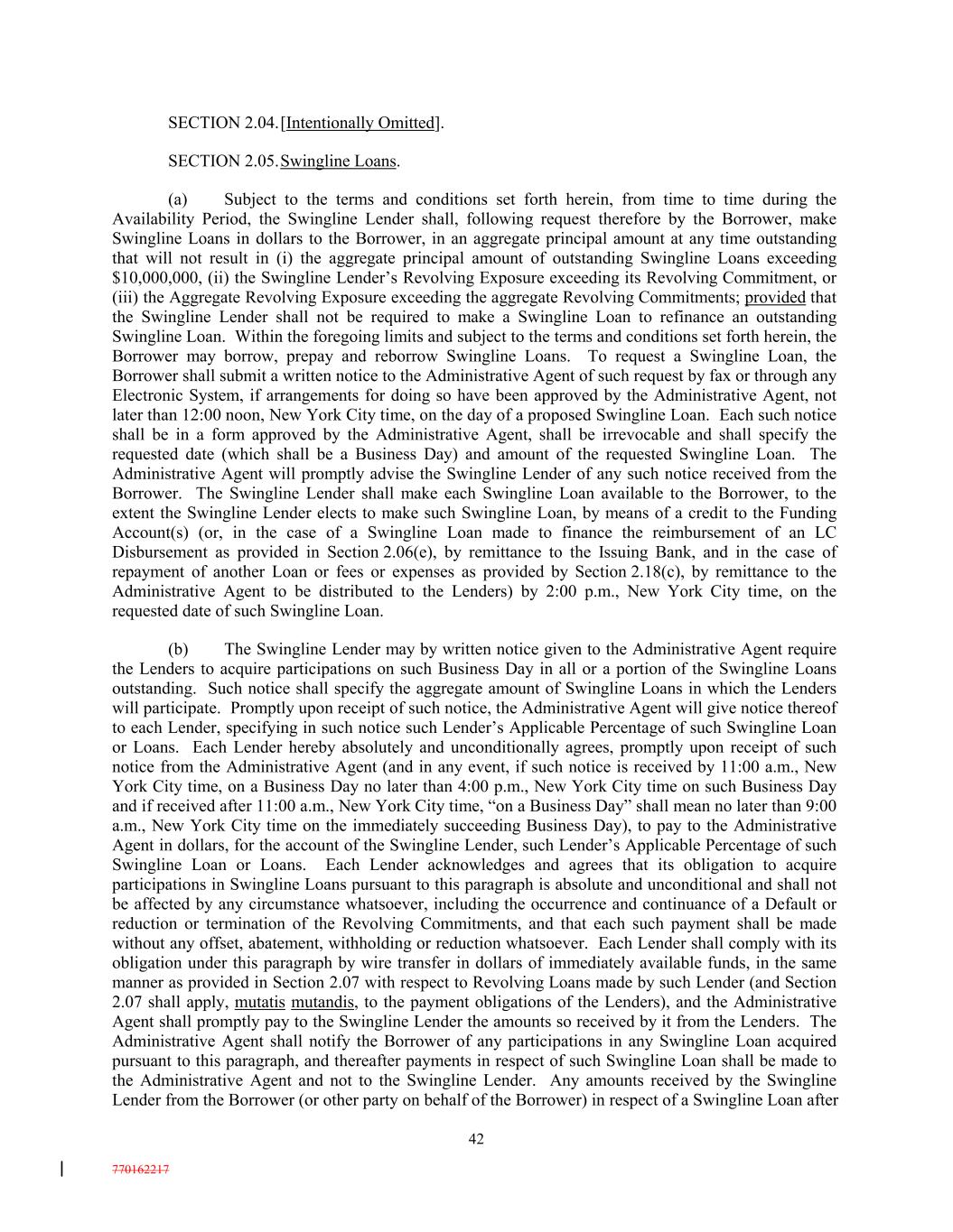 SECTION 2.04.[Intentionally Omitted]. SECTION 2.05.Swingline Loans. (a) Subject to the terms and conditions set forth herein, from time to time during the Availability Period, the Swingline Lender shall, following request therefore by the Borrower, make Swingline Loans in dollars to the Borrower, in an aggregate principal amount at any time outstanding that will not result in (i) the aggregate principal amount of outstanding Swingline Loans exceeding $10,000,000, (ii) the Swingline Lender’s Revolving Exposure exceeding its Revolving Commitment, or (iii) the Aggregate Revolving Exposure exceeding the aggregate Revolving Commitments; provided that the Swingline Lender shall not be required to make a Swingline Loan to refinance an outstanding Swingline Loan. Within the foregoing limits and subject to the terms and conditions set forth herein, the Borrower may borrow, prepay and reborrow Swingline Loans. To request a Swingline Loan, the Borrower shall submit a written notice to the Administrative Agent of such request by fax or through any Electronic System, if arrangements for doing so have been approved by the Administrative Agent, not later than 12:00 noon, New York City time, on the day of a proposed Swingline Loan. Each such notice shall be in a form approved by the Administrative Agent, shall be irrevocable and shall specify the requested date (which shall be a Business Day) and amount of the requested Swingline Loan. The Administrative Agent will promptly advise the Swingline Lender of any such notice received from the Borrower. The Swingline Lender shall make each Swingline Loan available to the Borrower, to the extent the Swingline Lender elects to make such Swingline Loan, by means of a credit to the Funding Account(s) (or, in the case of a Swingline Loan made to finance the reimbursement of an LC Disbursement as provided in Section 2.06(e), by remittance to the Issuing Bank, and in the case of repayment of another Loan or fees or expenses as provided by Section 2.18(c), by remittance to the Administrative Agent to be distributed to the Lenders) by 2:00 p.m., New York City time, on the requested date of such Swingline Loan. (b) The Swingline Lender may by written notice given to the Administrative Agent require the Lenders to acquire participations on such Business Day in all or a portion of the Swingline Loans outstanding. Such notice shall specify the aggregate amount of Swingline Loans in which the Lenders will participate. Promptly upon receipt of such notice, the Administrative Agent will give notice thereof to each Lender, specifying in such notice such Lender’s Applicable Percentage of such Swingline Loan or Loans. Each Lender hereby absolutely and unconditionally agrees, promptly upon receipt of such notice from the Administrative Agent (and in any event, if such notice is received by 11:00 a.m., New York City time, on a Business Day no later than 4:00 p.m., New York City time on such Business Day and if received after 11:00 a.m., New York City time, “on a Business Day” shall mean no later than 9:00 a.m., New York City time on the immediately succeeding Business Day), to pay to the Administrative Agent in dollars, for the account of the Swingline Lender, such Lender’s Applicable Percentage of such Swingline Loan or Loans. Each Lender acknowledges and agrees that its obligation to acquire participations in Swingline Loans pursuant to this paragraph is absolute and unconditional and shall not be affected by any circumstance whatsoever, including the occurrence and continuance of a Default or reduction or termination of the Revolving Commitments, and that each such payment shall be made without any offset, abatement, withholding or reduction whatsoever. Each Lender shall comply with its obligation under this paragraph by wire transfer in dollars of immediately available funds, in the same manner as provided in Section 2.07 with respect to Revolving Loans made by such Lender (and Section 2.07 shall apply, mutatis mutandis, to the payment obligations of the Lenders), and the Administrative Agent shall promptly pay to the Swingline Lender the amounts so received by it from the Lenders. The Administrative Agent shall notify the Borrower of any participations in any Swingline Loan acquired pursuant to this paragraph, and thereafter payments in respect of such Swingline Loan shall be made to the Administrative Agent and not to the Swingline Lender. Any amounts received by the Swingline Lender from the Borrower (or other party on behalf of the Borrower) in respect of a Swingline Loan after 42 770162217