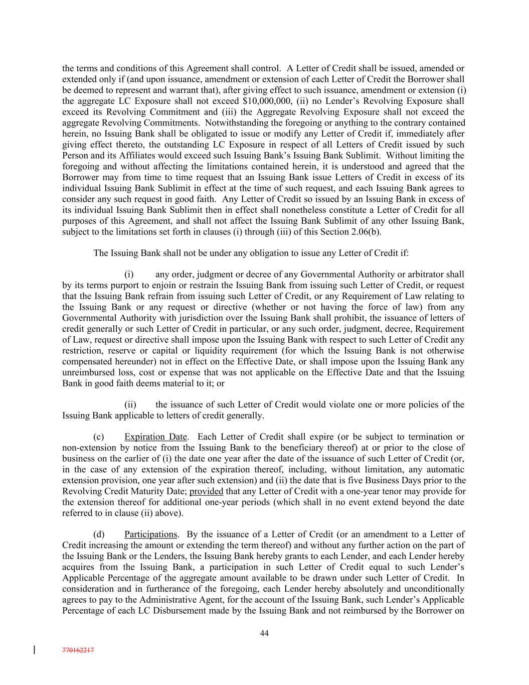 the terms and conditions of this Agreement shall control. A Letter of Credit shall be issued, amended or extended only if (and upon issuance, amendment or extension of each Letter of Credit the Borrower shall be deemed to represent and warrant that), after giving effect to such issuance, amendment or extension (i) the aggregate LC Exposure shall not exceed $10,000,000, (ii) no Lender’s Revolving Exposure shall exceed its Revolving Commitment and (iii) the Aggregate Revolving Exposure shall not exceed the aggregate Revolving Commitments. Notwithstanding the foregoing or anything to the contrary contained herein, no Issuing Bank shall be obligated to issue or modify any Letter of Credit if, immediately after giving effect thereto, the outstanding LC Exposure in respect of all Letters of Credit issued by such Person and its Affiliates would exceed such Issuing Bank’s Issuing Bank Sublimit. Without limiting the foregoing and without affecting the limitations contained herein, it is understood and agreed that the Borrower may from time to time request that an Issuing Bank issue Letters of Credit in excess of its individual Issuing Bank Sublimit in effect at the time of such request, and each Issuing Bank agrees to consider any such request in good faith. Any Letter of Credit so issued by an Issuing Bank in excess of its individual Issuing Bank Sublimit then in effect shall nonetheless constitute a Letter of Credit for all purposes of this Agreement, and shall not affect the Issuing Bank Sublimit of any other Issuing Bank, subject to the limitations set forth in clauses (i) through (iii) of this Section 2.06(b). The Issuing Bank shall not be under any obligation to issue any Letter of Credit if: (i) any order, judgment or decree of any Governmental Authority or arbitrator shall by its terms purport to enjoin or restrain the Issuing Bank from issuing such Letter of Credit, or request that the Issuing Bank refrain from issuing such Letter of Credit, or any Requirement of Law relating to the Issuing Bank or any request or directive (whether or not having the force of law) from any Governmental Authority with jurisdiction over the Issuing Bank shall prohibit, the issuance of letters of credit generally or such Letter of Credit in particular, or any such order, judgment, decree, Requirement of Law, request or directive shall impose upon the Issuing Bank with respect to such Letter of Credit any restriction, reserve or capital or liquidity requirement (for which the Issuing Bank is not otherwise compensated hereunder) not in effect on the Effective Date, or shall impose upon the Issuing Bank any unreimbursed loss, cost or expense that was not applicable on the Effective Date and that the Issuing Bank in good faith deems material to it; or (ii) the issuance of such Letter of Credit would violate one or more policies of the Issuing Bank applicable to letters of credit generally. (c) Expiration Date. Each Letter of Credit shall expire (or be subject to termination or non-extension by notice from the Issuing Bank to the beneficiary thereof) at or prior to the close of business on the earlier of (i) the date one year after the date of the issuance of such Letter of Credit (or, in the case of any extension of the expiration thereof, including, without limitation, any automatic extension provision, one year after such extension) and (ii) the date that is five Business Days prior to the Revolving Credit Maturity Date; provided that any Letter of Credit with a one-year tenor may provide for the extension thereof for additional one-year periods (which shall in no event extend beyond the date referred to in clause (ii) above). (d) Participations. By the issuance of a Letter of Credit (or an amendment to a Letter of Credit increasing the amount or extending the term thereof) and without any further action on the part of the Issuing Bank or the Lenders, the Issuing Bank hereby grants to each Lender, and each Lender hereby acquires from the Issuing Bank, a participation in such Letter of Credit equal to such Lender’s Applicable Percentage of the aggregate amount available to be drawn under such Letter of Credit. In consideration and in furtherance of the foregoing, each Lender hereby absolutely and unconditionally agrees to pay to the Administrative Agent, for the account of the Issuing Bank, such Lender’s Applicable Percentage of each LC Disbursement made by the Issuing Bank and not reimbursed by the Borrower on 44 770162217