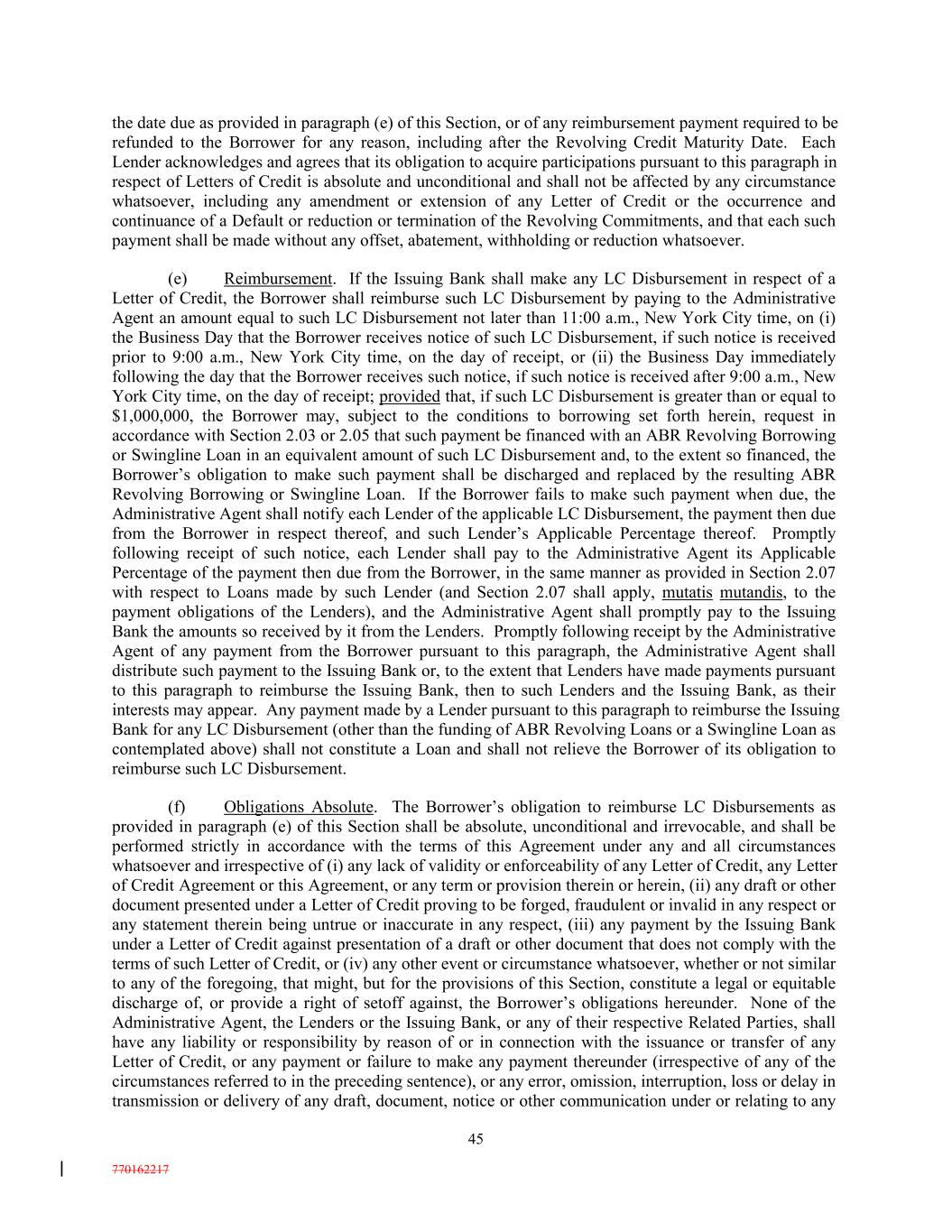 the date due as provided in paragraph (e) of this Section, or of any reimbursement payment required to be refunded to the Borrower for any reason, including after the Revolving Credit Maturity Date. Each Lender acknowledges and agrees that its obligation to acquire participations pursuant to this paragraph in respect of Letters of Credit is absolute and unconditional and shall not be affected by any circumstance whatsoever, including any amendment or extension of any Letter of Credit or the occurrence and continuance of a Default or reduction or termination of the Revolving Commitments, and that each such payment shall be made without any offset, abatement, withholding or reduction whatsoever. (e) Reimbursement. If the Issuing Bank shall make any LC Disbursement in respect of a Letter of Credit, the Borrower shall reimburse such LC Disbursement by paying to the Administrative Agent an amount equal to such LC Disbursement not later than 11:00 a.m., New York City time, on (i) the Business Day that the Borrower receives notice of such LC Disbursement, if such notice is received prior to 9:00 a.m., New York City time, on the day of receipt, or (ii) the Business Day immediately following the day that the Borrower receives such notice, if such notice is received after 9:00 a.m., New York City time, on the day of receipt; provided that, if such LC Disbursement is greater than or equal to $1,000,000, the Borrower may, subject to the conditions to borrowing set forth herein, request in accordance with Section 2.03 or 2.05 that such payment be financed with an ABR Revolving Borrowing or Swingline Loan in an equivalent amount of such LC Disbursement and, to the extent so financed, the Borrower’s obligation to make such payment shall be discharged and replaced by the resulting ABR Revolving Borrowing or Swingline Loan. If the Borrower fails to make such payment when due, the Administrative Agent shall notify each Lender of the applicable LC Disbursement, the payment then due from the Borrower in respect thereof, and such Lender’s Applicable Percentage thereof. Promptly following receipt of such notice, each Lender shall pay to the Administrative Agent its Applicable Percentage of the payment then due from the Borrower, in the same manner as provided in Section 2.07 with respect to Loans made by such Lender (and Section 2.07 shall apply, mutatis mutandis, to the payment obligations of the Lenders), and the Administrative Agent shall promptly pay to the Issuing Bank the amounts so received by it from the Lenders. Promptly following receipt by the Administrative Agent of any payment from the Borrower pursuant to this paragraph, the Administrative Agent shall distribute such payment to the Issuing Bank or, to the extent that Lenders have made payments pursuant to this paragraph to reimburse the Issuing Bank, then to such Lenders and the Issuing Bank, as their interests may appear. Any payment made by a Lender pursuant to this paragraph to reimburse the Issuing Bank for any LC Disbursement (other than the funding of ABR Revolving Loans or a Swingline Loan as contemplated above) shall not constitute a Loan and shall not relieve the Borrower of its obligation to reimburse such LC Disbursement. (f) Obligations Absolute. The Borrower’s obligation to reimburse LC Disbursements as provided in paragraph (e) of this Section shall be absolute, unconditional and irrevocable, and shall be performed strictly in accordance with the terms of this Agreement under any and all circumstances whatsoever and irrespective of (i) any lack of validity or enforceability of any Letter of Credit, any Letter of Credit Agreement or this Agreement, or any term or provision therein or herein, (ii) any draft or other document presented under a Letter of Credit proving to be forged, fraudulent or invalid in any respect or any statement therein being untrue or inaccurate in any respect, (iii) any payment by the Issuing Bank under a Letter of Credit against presentation of a draft or other document that does not comply with the terms of such Letter of Credit, or (iv) any other event or circumstance whatsoever, whether or not similar to any of the foregoing, that might, but for the provisions of this Section, constitute a legal or equitable discharge of, or provide a right of setoff against, the Borrower’s obligations hereunder. None of the Administrative Agent, the Lenders or the Issuing Bank, or any of their respective Related Parties, shall have any liability or responsibility by reason of or in connection with the issuance or transfer of any Letter of Credit, or any payment or failure to make any payment thereunder (irrespective of any of the circumstances referred to in the preceding sentence), or any error, omission, interruption, loss or delay in transmission or delivery of any draft, document, notice or other communication under or relating to any 45 770162217