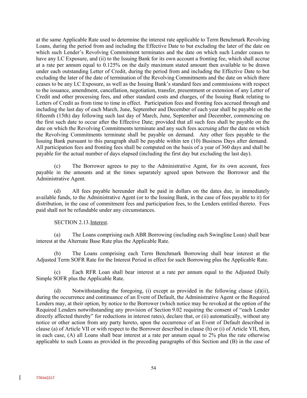 at the same Applicable Rate used to determine the interest rate applicable to Term Benchmark Revolving Loans, during the period from and including the Effective Date to but excluding the later of the date on which such Lender’s Revolving Commitment terminates and the date on which such Lender ceases to have any LC Exposure, and (ii) to the Issuing Bank for its own account a fronting fee, which shall accrue at a rate per annum equal to 0.125% on the daily maximum stated amount then available to be drawn under each outstanding Letter of Credit, during the period from and including the Effective Date to but excluding the later of the date of termination of the Revolving Commitments and the date on which there ceases to be any LC Exposure, as well as the Issuing Bank’s standard fees and commissions with respect to the issuance, amendment, cancellation, negotiation, transfer, presentment or extension of any Letter of Credit and other processing fees, and other standard costs and charges, of the Issuing Bank relating to Letters of Credit as from time to time in effect. Participation fees and fronting fees accrued through and including the last day of each March, June, September and December of each year shall be payable on the fifteenth (15th) day following such last day of March, June, September and December, commencing on the first such date to occur after the Effective Date; provided that all such fees shall be payable on the date on which the Revolving Commitments terminate and any such fees accruing after the date on which the Revolving Commitments terminate shall be payable on demand. Any other fees payable to the Issuing Bank pursuant to this paragraph shall be payable within ten (10) Business Days after demand. All participation fees and fronting fees shall be computed on the basis of a year of 360 days and shall be payable for the actual number of days elapsed (including the first day but excluding the last day). (c) The Borrower agrees to pay to the Administrative Agent, for its own account, fees payable in the amounts and at the times separately agreed upon between the Borrower and the Administrative Agent. (d) All fees payable hereunder shall be paid in dollars on the dates due, in immediately available funds, to the Administrative Agent (or to the Issuing Bank, in the case of fees payable to it) for distribution, in the case of commitment fees and participation fees, to the Lenders entitled thereto. Fees paid shall not be refundable under any circumstances. SECTION 2.13.Interest. (a) The Loans comprising each ABR Borrowing (including each Swingline Loan) shall bear interest at the Alternate Base Rate plus the Applicable Rate. (b) The Loans comprising each Term Benchmark Borrowing shall bear interest at the Adjusted Term SOFR Rate for the Interest Period in effect for such Borrowing plus the Applicable Rate. (c) Each RFR Loan shall bear interest at a rate per annum equal to the Adjusted Daily Simple SOFR plus the Applicable Rate. (d) Notwithstanding the foregoing, (i) except as provided in the following clause (d)(ii), during the occurrence and continuance of an Event of Default, the Administrative Agent or the Required Lenders may, at their option, by notice to the Borrower (which notice may be revoked at the option of the Required Lenders notwithstanding any provision of Section 9.02 requiring the consent of “each Lender directly affected thereby” for reductions in interest rates), declare that, or (ii) automatically, without any notice or other action from any party hereto, upon the occurrence of an Event of Default described in clause (a) of Article VII or with respect to the Borrower described in clause (h) or (i) of Article VII, then, in each case, (A) all Loans shall bear interest at a rate per annum equal to 2% plus the rate otherwise applicable to such Loans as provided in the preceding paragraphs of this Section and (B) in the case of 54 770162217