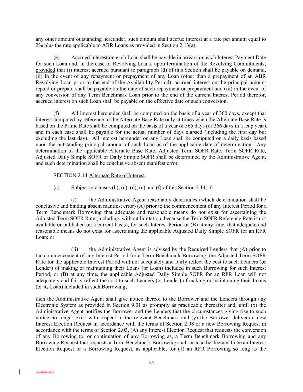 any other amount outstanding hereunder, such amount shall accrue interest at a rate per annum equal to 2% plus the rate applicable to ABR Loans as provided in Section 2.13(a). (e) Accrued interest on each Loan shall be payable in arrears on each Interest Payment Date for such Loan and, in the case of Revolving Loans, upon termination of the Revolving Commitments; provided that (i) interest accrued pursuant to paragraph (d) of this Section shall be payable on demand, (ii) in the event of any repayment or prepayment of any Loan (other than a prepayment of an ABR Revolving Loan prior to the end of the Availability Period), accrued interest on the principal amount repaid or prepaid shall be payable on the date of such repayment or prepayment and (iii) in the event of any conversion of any Term Benchmark Loan prior to the end of the current Interest Period therefor, accrued interest on such Loan shall be payable on the effective date of such conversion. (f) All interest hereunder shall be computed on the basis of a year of 360 days, except that interest computed by reference to the Alternate Base Rate only at times when the Alternate Base Rate is based on the Prime Rate shall be computed on the basis of a year of 365 days (or 366 days in a leap year), and in each case shall be payable for the actual number of days elapsed (including the first day but excluding the last day). All interest hereunder on any Loan shall be computed on a daily basis based upon the outstanding principal amount of such Loan as of the applicable date of determination. Any determination of the applicable Alternate Base Rate, Adjusted Term SOFR Rate, Term SOFR Rate, Adjusted Daily Simple SOFR or Daily Simple SOFR shall be determined by the Administrative Agent, and such determination shall be conclusive absent manifest error. SECTION 2.14.Alternate Rate of Interest. (a) Subject to clauses (b), (c), (d), (e) and (f) of this Section 2.14, if: (i) the Administrative Agent reasonably determines (which determination shall be conclusive and binding absent manifest error) (A) prior to the commencement of any Interest Period for a Term Benchmark Borrowing that adequate and reasonable means do not exist for ascertaining the Adjusted Term SOFR Rate (including, without limitation, because the Term SOFR Reference Rate is not available or published on a current basis), for such Interest Period or (B) at any time, that adequate and reasonable means do not exist for ascertaining the applicable Adjusted Daily Simple SOFR for an RFR Loan; or (ii) the Administrative Agent is advised by the Required Lenders that (A) prior to the commencement of any Interest Period for a Term Benchmark Borrowing, the Adjusted Term SOFR Rate for the applicable Interest Period will not adequately and fairly reflect the cost to such Lenders (or Lender) of making or maintaining their Loans (or Loan) included in such Borrowing for such Interest Period, or (B) at any time, the applicable Adjusted Daily Simple SOFR for an RFR Loan will not adequately and fairly reflect the cost to such Lenders (or Lender) of making or maintaining their Loans (or its Loan) included in such Borrowing; then the Administrative Agent shall give notice thereof to the Borrower and the Lenders through any Electronic System as provided in Section 9.01 as promptly as practicable thereafter and, until (x) the Administrative Agent notifies the Borrower and the Lenders that the circumstances giving rise to such notice no longer exist with respect to the relevant Benchmark and (y) the Borrower delivers a new Interest Election Request in accordance with the terms of Section 2.08 or a new Borrowing Request in accordance with the terms of Section 2.03, (A) any Interest Election Request that requests the conversion of any Borrowing to, or continuation of any Borrowing as, a Term Benchmark Borrowing and any Borrowing Request that requests a Term Benchmark Borrowing shall instead be deemed to be an Interest Election Request or a Borrowing Request, as applicable, for (1) an RFR Borrowing so long as the 55 770162217