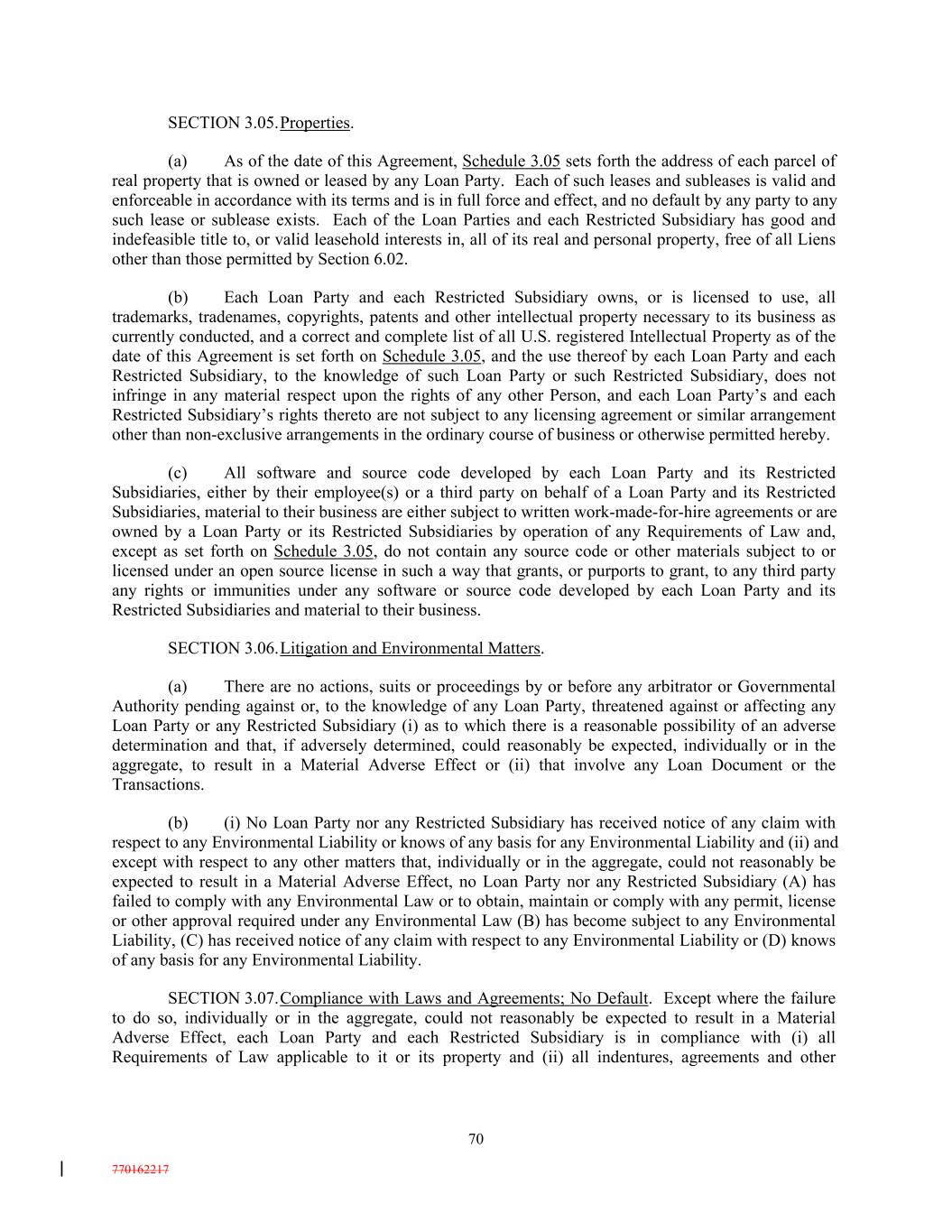 SECTION 3.05.Properties. (a) As of the date of this Agreement, Schedule 3.05 sets forth the address of each parcel of real property that is owned or leased by any Loan Party. Each of such leases and subleases is valid and enforceable in accordance with its terms and is in full force and effect, and no default by any party to any such lease or sublease exists. Each of the Loan Parties and each Restricted Subsidiary has good and indefeasible title to, or valid leasehold interests in, all of its real and personal property, free of all Liens other than those permitted by Section 6.02. (b) Each Loan Party and each Restricted Subsidiary owns, or is licensed to use, all trademarks, tradenames, copyrights, patents and other intellectual property necessary to its business as currently conducted, and a correct and complete list of all U.S. registered Intellectual Property as of the date of this Agreement is set forth on Schedule 3.05, and the use thereof by each Loan Party and each Restricted Subsidiary, to the knowledge of such Loan Party or such Restricted Subsidiary, does not infringe in any material respect upon the rights of any other Person, and each Loan Party’s and each Restricted Subsidiary’s rights thereto are not subject to any licensing agreement or similar arrangement other than non-exclusive arrangements in the ordinary course of business or otherwise permitted hereby. (c) All software and source code developed by each Loan Party and its Restricted Subsidiaries, either by their employee(s) or a third party on behalf of a Loan Party and its Restricted Subsidiaries, material to their business are either subject to written work-made-for-hire agreements or are owned by a Loan Party or its Restricted Subsidiaries by operation of any Requirements of Law and, except as set forth on Schedule 3.05, do not contain any source code or other materials subject to or licensed under an open source license in such a way that grants, or purports to grant, to any third party any rights or immunities under any software or source code developed by each Loan Party and its Restricted Subsidiaries and material to their business. SECTION 3.06.Litigation and Environmental Matters. (a) There are no actions, suits or proceedings by or before any arbitrator or Governmental Authority pending against or, to the knowledge of any Loan Party, threatened against or affecting any Loan Party or any Restricted Subsidiary (i) as to which there is a reasonable possibility of an adverse determination and that, if adversely determined, could reasonably be expected, individually or in the aggregate, to result in a Material Adverse Effect or (ii) that involve any Loan Document or the Transactions. (b) (i) No Loan Party nor any Restricted Subsidiary has received notice of any claim with respect to any Environmental Liability or knows of any basis for any Environmental Liability and (ii) and except with respect to any other matters that, individually or in the aggregate, could not reasonably be expected to result in a Material Adverse Effect, no Loan Party nor any Restricted Subsidiary (A) has failed to comply with any Environmental Law or to obtain, maintain or comply with any permit, license or other approval required under any Environmental Law (B) has become subject to any Environmental Liability, (C) has received notice of any claim with respect to any Environmental Liability or (D) knows of any basis for any Environmental Liability. SECTION 3.07.Compliance with Laws and Agreements; No Default. Except where the failure to do so, individually or in the aggregate, could not reasonably be expected to result in a Material Adverse Effect, each Loan Party and each Restricted Subsidiary is in compliance with (i) all Requirements of Law applicable to it or its property and (ii) all indentures, agreements and other 70 770162217