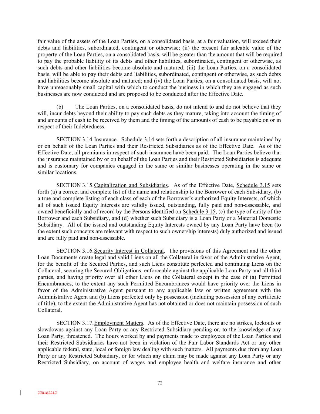 fair value of the assets of the Loan Parties, on a consolidated basis, at a fair valuation, will exceed their debts and liabilities, subordinated, contingent or otherwise; (ii) the present fair saleable value of the property of the Loan Parties, on a consolidated basis, will be greater than the amount that will be required to pay the probable liability of its debts and other liabilities, subordinated, contingent or otherwise, as such debts and other liabilities become absolute and matured; (iii) the Loan Parties, on a consolidated basis, will be able to pay their debts and liabilities, subordinated, contingent or otherwise, as such debts and liabilities become absolute and matured; and (iv) the Loan Parties, on a consolidated basis, will not have unreasonably small capital with which to conduct the business in which they are engaged as such businesses are now conducted and are proposed to be conducted after the Effective Date. (b) The Loan Parties, on a consolidated basis, do not intend to and do not believe that they will, incur debts beyond their ability to pay such debts as they mature, taking into account the timing of and amounts of cash to be received by them and the timing of the amounts of cash to be payable on or in respect of their Indebtedness. SECTION 3.14.Insurance. Schedule 3.14 sets forth a description of all insurance maintained by or on behalf of the Loan Parties and their Restricted Subsidiaries as of the Effective Date. As of the Effective Date, all premiums in respect of such insurance have been paid. The Loan Parties believe that the insurance maintained by or on behalf of the Loan Parties and their Restricted Subsidiaries is adequate and is customary for companies engaged in the same or similar businesses operating in the same or similar locations. SECTION 3.15.Capitalization and Subsidiaries. As of the Effective Date, Schedule 3.15 sets forth (a) a correct and complete list of the name and relationship to the Borrower of each Subsidiary, (b) a true and complete listing of each class of each of the Borrower’s authorized Equity Interests, of which all of such issued Equity Interests are validly issued, outstanding, fully paid and non-assessable, and owned beneficially and of record by the Persons identified on Schedule 3.15, (c) the type of entity of the Borrower and each Subsidiary, and (d) whether such Subsidiary is a Loan Party or a Material Domestic Subsidiary. All of the issued and outstanding Equity Interests owned by any Loan Party have been (to the extent such concepts are relevant with respect to such ownership interests) duly authorized and issued and are fully paid and non-assessable. SECTION 3.16.Security Interest in Collateral. The provisions of this Agreement and the other Loan Documents create legal and valid Liens on all the Collateral in favor of the Administrative Agent, for the benefit of the Secured Parties, and such Liens constitute perfected and continuing Liens on the Collateral, securing the Secured Obligations, enforceable against the applicable Loan Party and all third parties, and having priority over all other Liens on the Collateral except in the case of (a) Permitted Encumbrances, to the extent any such Permitted Encumbrances would have priority over the Liens in favor of the Administrative Agent pursuant to any applicable law or written agreement with the Administrative Agent and (b) Liens perfected only by possession (including possession of any certificate of title), to the extent the Administrative Agent has not obtained or does not maintain possession of such Collateral. SECTION 3.17.Employment Matters. As of the Effective Date, there are no strikes, lockouts or slowdowns against any Loan Party or any Restricted Subsidiary pending or, to the knowledge of any Loan Party, threatened. The hours worked by and payments made to employees of the Loan Parties and their Restricted Subsidiaries have not been in violation of the Fair Labor Standards Act or any other applicable federal, state, local or foreign law dealing with such matters. All payments due from any Loan Party or any Restricted Subsidiary, or for which any claim may be made against any Loan Party or any Restricted Subsidiary, on account of wages and employee health and welfare insurance and other 72 770162217