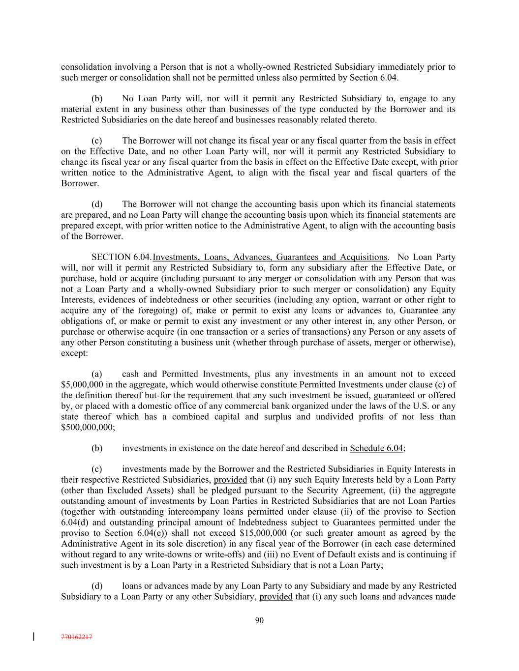 consolidation involving a Person that is not a wholly-owned Restricted Subsidiary immediately prior to such merger or consolidation shall not be permitted unless also permitted by Section 6.04. (b) No Loan Party will, nor will it permit any Restricted Subsidiary to, engage to any material extent in any business other than businesses of the type conducted by the Borrower and its Restricted Subsidiaries on the date hereof and businesses reasonably related thereto. (c) The Borrower will not change its fiscal year or any fiscal quarter from the basis in effect on the Effective Date, and no other Loan Party will, nor will it permit any Restricted Subsidiary to change its fiscal year or any fiscal quarter from the basis in effect on the Effective Date except, with prior written notice to the Administrative Agent, to align with the fiscal year and fiscal quarters of the Borrower. (d) The Borrower will not change the accounting basis upon which its financial statements are prepared, and no Loan Party will change the accounting basis upon which its financial statements are prepared except, with prior written notice to the Administrative Agent, to align with the accounting basis of the Borrower. SECTION 6.04.Investments, Loans, Advances, Guarantees and Acquisitions. No Loan Party will, nor will it permit any Restricted Subsidiary to, form any subsidiary after the Effective Date, or purchase, hold or acquire (including pursuant to any merger or consolidation with any Person that was not a Loan Party and a wholly-owned Subsidiary prior to such merger or consolidation) any Equity Interests, evidences of indebtedness or other securities (including any option, warrant or other right to acquire any of the foregoing) of, make or permit to exist any loans or advances to, Guarantee any obligations of, or make or permit to exist any investment or any other interest in, any other Person, or purchase or otherwise acquire (in one transaction or a series of transactions) any Person or any assets of any other Person constituting a business unit (whether through purchase of assets, merger or otherwise), except: (a) cash and Permitted Investments, plus any investments in an amount not to exceed $5,000,000 in the aggregate, which would otherwise constitute Permitted Investments under clause (c) of the definition thereof but-for the requirement that any such investment be issued, guaranteed or offered by, or placed with a domestic office of any commercial bank organized under the laws of the U.S. or any state thereof which has a combined capital and surplus and undivided profits of not less than $500,000,000; (b) investments in existence on the date hereof and described in Schedule 6.04; (c) investments made by the Borrower and the Restricted Subsidiaries in Equity Interests in their respective Restricted Subsidiaries, provided that (i) any such Equity Interests held by a Loan Party (other than Excluded Assets) shall be pledged pursuant to the Security Agreement, (ii) the aggregate outstanding amount of investments by Loan Parties in Restricted Subsidiaries that are not Loan Parties (together with outstanding intercompany loans permitted under clause (ii) of the proviso to Section 6.04(d) and outstanding principal amount of Indebtedness subject to Guarantees permitted under the proviso to Section 6.04(e)) shall not exceed $15,000,000 (or such greater amount as agreed by the Administrative Agent in its sole discretion) in any fiscal year of the Borrower (in each case determined without regard to any write-downs or write-offs) and (iii) no Event of Default exists and is continuing if such investment is by a Loan Party in a Restricted Subsidiary that is not a Loan Party; (d) loans or advances made by any Loan Party to any Subsidiary and made by any Restricted Subsidiary to a Loan Party or any other Subsidiary, provided that (i) any such loans and advances made 90 770162217