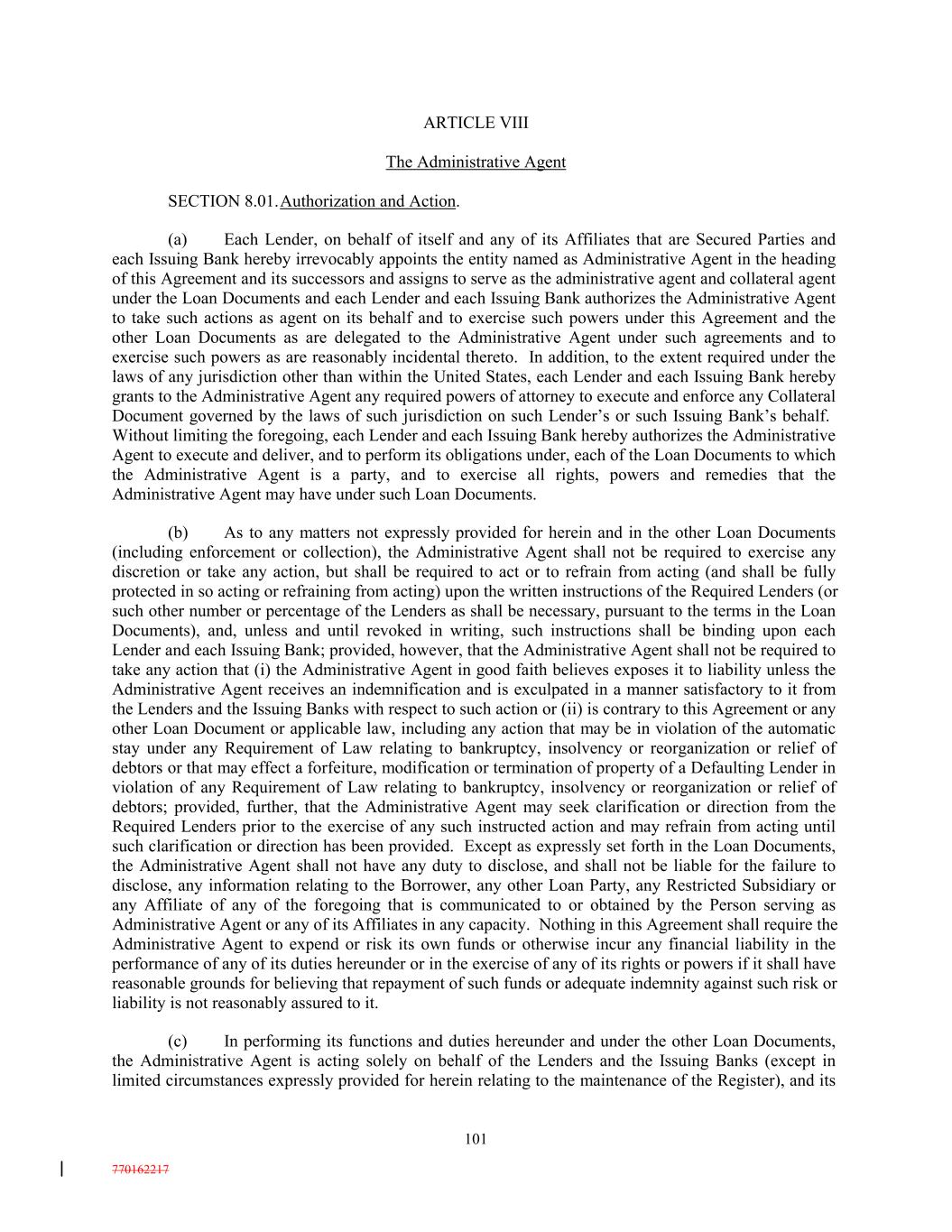 ARTICLE VIII The Administrative Agent SECTION 8.01.Authorization and Action. (a) Each Lender, on behalf of itself and any of its Affiliates that are Secured Parties and each Issuing Bank hereby irrevocably appoints the entity named as Administrative Agent in the heading of this Agreement and its successors and assigns to serve as the administrative agent and collateral agent under the Loan Documents and each Lender and each Issuing Bank authorizes the Administrative Agent to take such actions as agent on its behalf and to exercise such powers under this Agreement and the other Loan Documents as are delegated to the Administrative Agent under such agreements and to exercise such powers as are reasonably incidental thereto. In addition, to the extent required under the laws of any jurisdiction other than within the United States, each Lender and each Issuing Bank hereby grants to the Administrative Agent any required powers of attorney to execute and enforce any Collateral Document governed by the laws of such jurisdiction on such Lender’s or such Issuing Bank’s behalf. Without limiting the foregoing, each Lender and each Issuing Bank hereby authorizes the Administrative Agent to execute and deliver, and to perform its obligations under, each of the Loan Documents to which the Administrative Agent is a party, and to exercise all rights, powers and remedies that the Administrative Agent may have under such Loan Documents. (b) As to any matters not expressly provided for herein and in the other Loan Documents (including enforcement or collection), the Administrative Agent shall not be required to exercise any discretion or take any action, but shall be required to act or to refrain from acting (and shall be fully protected in so acting or refraining from acting) upon the written instructions of the Required Lenders (or such other number or percentage of the Lenders as shall be necessary, pursuant to the terms in the Loan Documents), and, unless and until revoked in writing, such instructions shall be binding upon each Lender and each Issuing Bank; provided, however, that the Administrative Agent shall not be required to take any action that (i) the Administrative Agent in good faith believes exposes it to liability unless the Administrative Agent receives an indemnification and is exculpated in a manner satisfactory to it from the Lenders and the Issuing Banks with respect to such action or (ii) is contrary to this Agreement or any other Loan Document or applicable law, including any action that may be in violation of the automatic stay under any Requirement of Law relating to bankruptcy, insolvency or reorganization or relief of debtors or that may effect a forfeiture, modification or termination of property of a Defaulting Lender in violation of any Requirement of Law relating to bankruptcy, insolvency or reorganization or relief of debtors; provided, further, that the Administrative Agent may seek clarification or direction from the Required Lenders prior to the exercise of any such instructed action and may refrain from acting until such clarification or direction has been provided. Except as expressly set forth in the Loan Documents, the Administrative Agent shall not have any duty to disclose, and shall not be liable for the failure to disclose, any information relating to the Borrower, any other Loan Party, any Restricted Subsidiary or any Affiliate of any of the foregoing that is communicated to or obtained by the Person serving as Administrative Agent or any of its Affiliates in any capacity. Nothing in this Agreement shall require the Administrative Agent to expend or risk its own funds or otherwise incur any financial liability in the performance of any of its duties hereunder or in the exercise of any of its rights or powers if it shall have reasonable grounds for believing that repayment of such funds or adequate indemnity against such risk or liability is not reasonably assured to it. (c) In performing its functions and duties hereunder and under the other Loan Documents, the Administrative Agent is acting solely on behalf of the Lenders and the Issuing Banks (except in limited circumstances expressly provided for herein relating to the maintenance of the Register), and its 101 770162217