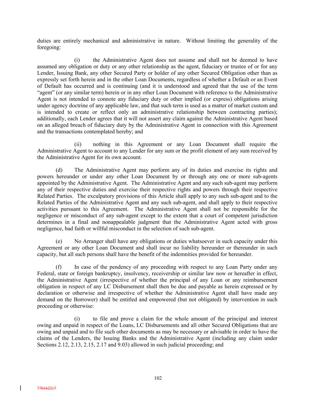 duties are entirely mechanical and administrative in nature. Without limiting the generality of the foregoing: (i) the Administrative Agent does not assume and shall not be deemed to have assumed any obligation or duty or any other relationship as the agent, fiduciary or trustee of or for any Lender, Issuing Bank, any other Secured Party or holder of any other Secured Obligation other than as expressly set forth herein and in the other Loan Documents, regardless of whether a Default or an Event of Default has occurred and is continuing (and it is understood and agreed that the use of the term “agent” (or any similar term) herein or in any other Loan Document with reference to the Administrative Agent is not intended to connote any fiduciary duty or other implied (or express) obligations arising under agency doctrine of any applicable law, and that such term is used as a matter of market custom and is intended to create or reflect only an administrative relationship between contracting parties); additionally, each Lender agrees that it will not assert any claim against the Administrative Agent based on an alleged breach of fiduciary duty by the Administrative Agent in connection with this Agreement and the transactions contemplated hereby; and (ii) nothing in this Agreement or any Loan Document shall require the Administrative Agent to account to any Lender for any sum or the profit element of any sum received by the Administrative Agent for its own account. (d) The Administrative Agent may perform any of its duties and exercise its rights and powers hereunder or under any other Loan Document by or through any one or more sub-agents appointed by the Administrative Agent. The Administrative Agent and any such sub-agent may perform any of their respective duties and exercise their respective rights and powers through their respective Related Parties. The exculpatory provisions of this Article shall apply to any such sub-agent and to the Related Parties of the Administrative Agent and any such sub-agent, and shall apply to their respective activities pursuant to this Agreement. The Administrative Agent shall not be responsible for the negligence or misconduct of any sub-agent except to the extent that a court of competent jurisdiction determines in a final and nonappealable judgment that the Administrative Agent acted with gross negligence, bad faith or willful misconduct in the selection of such sub-agent. (e) No Arranger shall have any obligations or duties whatsoever in such capacity under this Agreement or any other Loan Document and shall incur no liability hereunder or thereunder in such capacity, but all such persons shall have the benefit of the indemnities provided for hereunder. (f) In case of the pendency of any proceeding with respect to any Loan Party under any Federal, state or foreign bankruptcy, insolvency, receivership or similar law now or hereafter in effect, the Administrative Agent (irrespective of whether the principal of any Loan or any reimbursement obligation in respect of any LC Disbursement shall then be due and payable as herein expressed or by declaration or otherwise and irrespective of whether the Administrative Agent shall have made any demand on the Borrower) shall be entitled and empowered (but not obligated) by intervention in such proceeding or otherwise: (i) to file and prove a claim for the whole amount of the principal and interest owing and unpaid in respect of the Loans, LC Disbursements and all other Secured Obligations that are owing and unpaid and to file such other documents as may be necessary or advisable in order to have the claims of the Lenders, the Issuing Banks and the Administrative Agent (including any claim under Sections 2.12, 2.13, 2.15, 2.17 and 9.03) allowed in such judicial proceeding; and 102 770162217