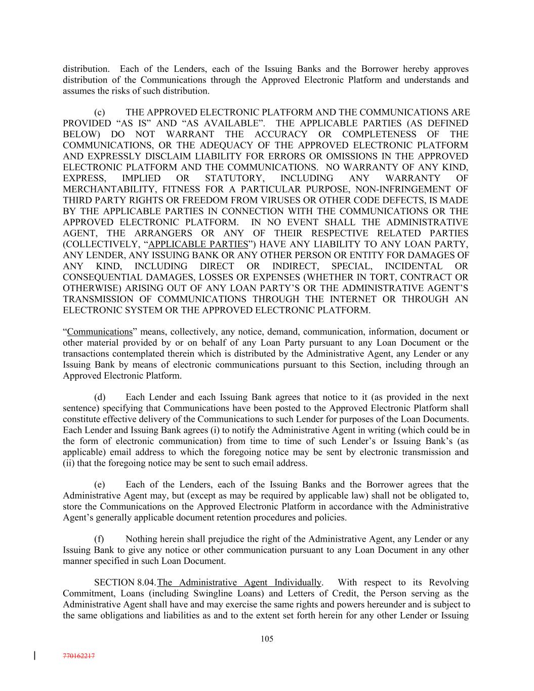 distribution. Each of the Lenders, each of the Issuing Banks and the Borrower hereby approves distribution of the Communications through the Approved Electronic Platform and understands and assumes the risks of such distribution. (c) THE APPROVED ELECTRONIC PLATFORM AND THE COMMUNICATIONS ARE PROVIDED “AS IS” AND “AS AVAILABLE”. THE APPLICABLE PARTIES (AS DEFINED BELOW) DO NOT WARRANT THE ACCURACY OR COMPLETENESS OF THE COMMUNICATIONS, OR THE ADEQUACY OF THE APPROVED ELECTRONIC PLATFORM AND EXPRESSLY DISCLAIM LIABILITY FOR ERRORS OR OMISSIONS IN THE APPROVED ELECTRONIC PLATFORM AND THE COMMUNICATIONS. NO WARRANTY OF ANY KIND, EXPRESS, IMPLIED OR STATUTORY, INCLUDING ANY WARRANTY OF MERCHANTABILITY, FITNESS FOR A PARTICULAR PURPOSE, NON-INFRINGEMENT OF THIRD PARTY RIGHTS OR FREEDOM FROM VIRUSES OR OTHER CODE DEFECTS, IS MADE BY THE APPLICABLE PARTIES IN CONNECTION WITH THE COMMUNICATIONS OR THE APPROVED ELECTRONIC PLATFORM. IN NO EVENT SHALL THE ADMINISTRATIVE AGENT, THE ARRANGERS OR ANY OF THEIR RESPECTIVE RELATED PARTIES (COLLECTIVELY, “APPLICABLE PARTIES”) HAVE ANY LIABILITY TO ANY LOAN PARTY, ANY LENDER, ANY ISSUING BANK OR ANY OTHER PERSON OR ENTITY FOR DAMAGES OF ANY KIND, INCLUDING DIRECT OR INDIRECT, SPECIAL, INCIDENTAL OR CONSEQUENTIAL DAMAGES, LOSSES OR EXPENSES (WHETHER IN TORT, CONTRACT OR OTHERWISE) ARISING OUT OF ANY LOAN PARTY’S OR THE ADMINISTRATIVE AGENT’S TRANSMISSION OF COMMUNICATIONS THROUGH THE INTERNET OR THROUGH AN ELECTRONIC SYSTEM OR THE APPROVED ELECTRONIC PLATFORM. “Communications” means, collectively, any notice, demand, communication, information, document or other material provided by or on behalf of any Loan Party pursuant to any Loan Document or the transactions contemplated therein which is distributed by the Administrative Agent, any Lender or any Issuing Bank by means of electronic communications pursuant to this Section, including through an Approved Electronic Platform. (d) Each Lender and each Issuing Bank agrees that notice to it (as provided in the next sentence) specifying that Communications have been posted to the Approved Electronic Platform shall constitute effective delivery of the Communications to such Lender for purposes of the Loan Documents. Each Lender and Issuing Bank agrees (i) to notify the Administrative Agent in writing (which could be in the form of electronic communication) from time to time of such Lender’s or Issuing Bank’s (as applicable) email address to which the foregoing notice may be sent by electronic transmission and (ii) that the foregoing notice may be sent to such email address. (e) Each of the Lenders, each of the Issuing Banks and the Borrower agrees that the Administrative Agent may, but (except as may be required by applicable law) shall not be obligated to, store the Communications on the Approved Electronic Platform in accordance with the Administrative Agent’s generally applicable document retention procedures and policies. (f) Nothing herein shall prejudice the right of the Administrative Agent, any Lender or any Issuing Bank to give any notice or other communication pursuant to any Loan Document in any other manner specified in such Loan Document. SECTION 8.04.The Administrative Agent Individually. With respect to its Revolving Commitment, Loans (including Swingline Loans) and Letters of Credit, the Person serving as the Administrative Agent shall have and may exercise the same rights and powers hereunder and is subject to the same obligations and liabilities as and to the extent set forth herein for any other Lender or Issuing 105 770162217