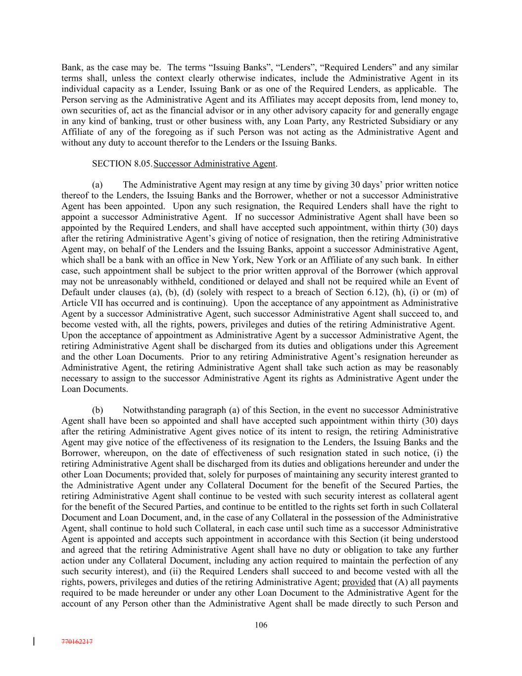 Bank, as the case may be. The terms “Issuing Banks”, “Lenders”, “Required Lenders” and any similar terms shall, unless the context clearly otherwise indicates, include the Administrative Agent in its individual capacity as a Lender, Issuing Bank or as one of the Required Lenders, as applicable. The Person serving as the Administrative Agent and its Affiliates may accept deposits from, lend money to, own securities of, act as the financial advisor or in any other advisory capacity for and generally engage in any kind of banking, trust or other business with, any Loan Party, any Restricted Subsidiary or any Affiliate of any of the foregoing as if such Person was not acting as the Administrative Agent and without any duty to account therefor to the Lenders or the Issuing Banks. SECTION 8.05.Successor Administrative Agent. (a) The Administrative Agent may resign at any time by giving 30 days’ prior written notice thereof to the Lenders, the Issuing Banks and the Borrower, whether or not a successor Administrative Agent has been appointed. Upon any such resignation, the Required Lenders shall have the right to appoint a successor Administrative Agent. If no successor Administrative Agent shall have been so appointed by the Required Lenders, and shall have accepted such appointment, within thirty (30) days after the retiring Administrative Agent’s giving of notice of resignation, then the retiring Administrative Agent may, on behalf of the Lenders and the Issuing Banks, appoint a successor Administrative Agent, which shall be a bank with an office in New York, New York or an Affiliate of any such bank. In either case, such appointment shall be subject to the prior written approval of the Borrower (which approval may not be unreasonably withheld, conditioned or delayed and shall not be required while an Event of Default under clauses (a), (b), (d) (solely with respect to a breach of Section 6.12), (h), (i) or (m) of Article VII has occurred and is continuing). Upon the acceptance of any appointment as Administrative Agent by a successor Administrative Agent, such successor Administrative Agent shall succeed to, and become vested with, all the rights, powers, privileges and duties of the retiring Administrative Agent. Upon the acceptance of appointment as Administrative Agent by a successor Administrative Agent, the retiring Administrative Agent shall be discharged from its duties and obligations under this Agreement and the other Loan Documents. Prior to any retiring Administrative Agent’s resignation hereunder as Administrative Agent, the retiring Administrative Agent shall take such action as may be reasonably necessary to assign to the successor Administrative Agent its rights as Administrative Agent under the Loan Documents. (b) Notwithstanding paragraph (a) of this Section, in the event no successor Administrative Agent shall have been so appointed and shall have accepted such appointment within thirty (30) days after the retiring Administrative Agent gives notice of its intent to resign, the retiring Administrative Agent may give notice of the effectiveness of its resignation to the Lenders, the Issuing Banks and the Borrower, whereupon, on the date of effectiveness of such resignation stated in such notice, (i) the retiring Administrative Agent shall be discharged from its duties and obligations hereunder and under the other Loan Documents; provided that, solely for purposes of maintaining any security interest granted to the Administrative Agent under any Collateral Document for the benefit of the Secured Parties, the retiring Administrative Agent shall continue to be vested with such security interest as collateral agent for the benefit of the Secured Parties, and continue to be entitled to the rights set forth in such Collateral Document and Loan Document, and, in the case of any Collateral in the possession of the Administrative Agent, shall continue to hold such Collateral, in each case until such time as a successor Administrative Agent is appointed and accepts such appointment in accordance with this Section (it being understood and agreed that the retiring Administrative Agent shall have no duty or obligation to take any further action under any Collateral Document, including any action required to maintain the perfection of any such security interest), and (ii) the Required Lenders shall succeed to and become vested with all the rights, powers, privileges and duties of the retiring Administrative Agent; provided that (A) all payments required to be made hereunder or under any other Loan Document to the Administrative Agent for the account of any Person other than the Administrative Agent shall be made directly to such Person and 106 770162217