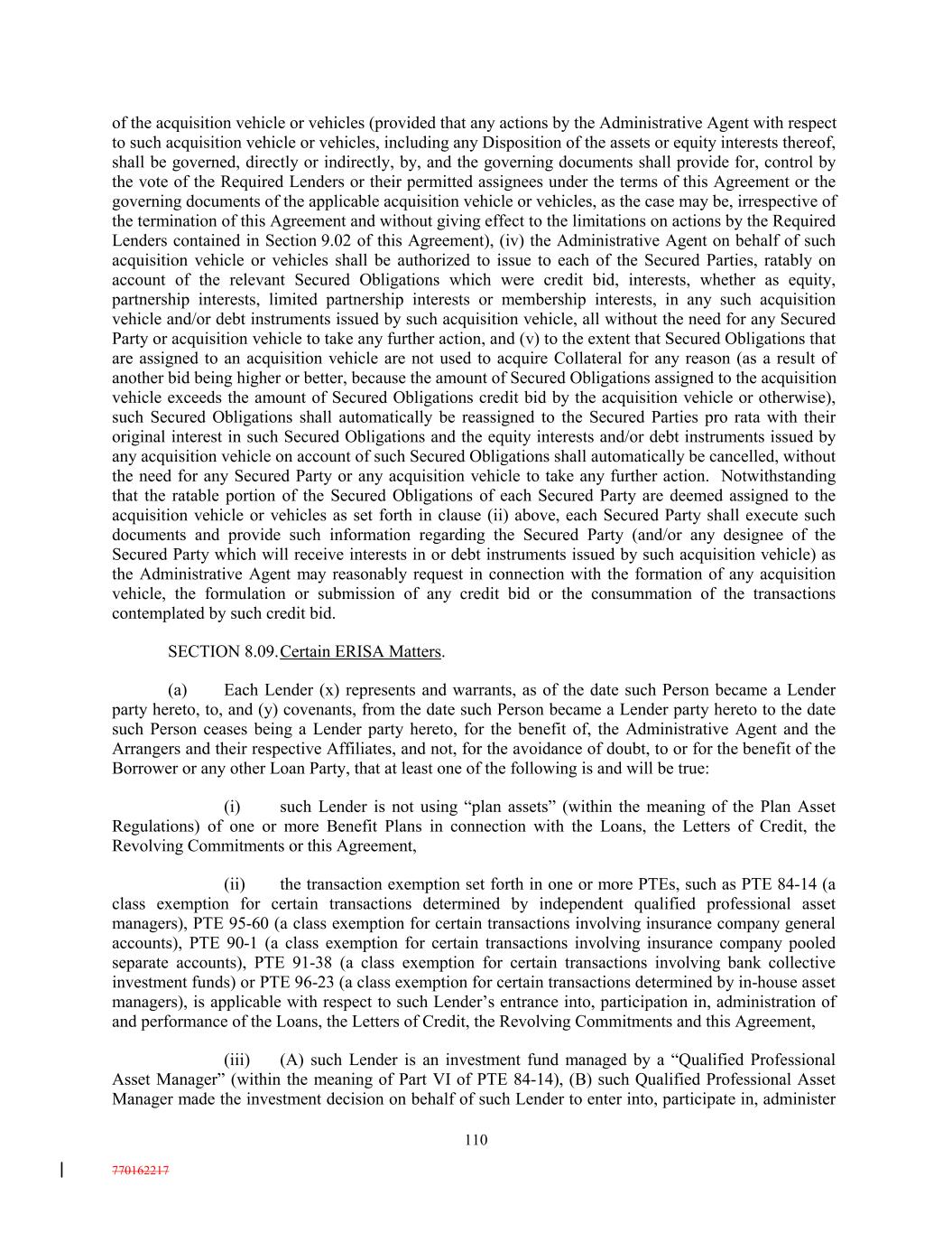 of the acquisition vehicle or vehicles (provided that any actions by the Administrative Agent with respect to such acquisition vehicle or vehicles, including any Disposition of the assets or equity interests thereof, shall be governed, directly or indirectly, by, and the governing documents shall provide for, control by the vote of the Required Lenders or their permitted assignees under the terms of this Agreement or the governing documents of the applicable acquisition vehicle or vehicles, as the case may be, irrespective of the termination of this Agreement and without giving effect to the limitations on actions by the Required Lenders contained in Section 9.02 of this Agreement), (iv) the Administrative Agent on behalf of such acquisition vehicle or vehicles shall be authorized to issue to each of the Secured Parties, ratably on account of the relevant Secured Obligations which were credit bid, interests, whether as equity, partnership interests, limited partnership interests or membership interests, in any such acquisition vehicle and/or debt instruments issued by such acquisition vehicle, all without the need for any Secured Party or acquisition vehicle to take any further action, and (v) to the extent that Secured Obligations that are assigned to an acquisition vehicle are not used to acquire Collateral for any reason (as a result of another bid being higher or better, because the amount of Secured Obligations assigned to the acquisition vehicle exceeds the amount of Secured Obligations credit bid by the acquisition vehicle or otherwise), such Secured Obligations shall automatically be reassigned to the Secured Parties pro rata with their original interest in such Secured Obligations and the equity interests and/or debt instruments issued by any acquisition vehicle on account of such Secured Obligations shall automatically be cancelled, without the need for any Secured Party or any acquisition vehicle to take any further action. Notwithstanding that the ratable portion of the Secured Obligations of each Secured Party are deemed assigned to the acquisition vehicle or vehicles as set forth in clause (ii) above, each Secured Party shall execute such documents and provide such information regarding the Secured Party (and/or any designee of the Secured Party which will receive interests in or debt instruments issued by such acquisition vehicle) as the Administrative Agent may reasonably request in connection with the formation of any acquisition vehicle, the formulation or submission of any credit bid or the consummation of the transactions contemplated by such credit bid. SECTION 8.09.Certain ERISA Matters. (a) Each Lender (x) represents and warrants, as of the date such Person became a Lender party hereto, to, and (y) covenants, from the date such Person became a Lender party hereto to the date such Person ceases being a Lender party hereto, for the benefit of, the Administrative Agent and the Arrangers and their respective Affiliates, and not, for the avoidance of doubt, to or for the benefit of the Borrower or any other Loan Party, that at least one of the following is and will be true: (i) such Lender is not using “plan assets” (within the meaning of the Plan Asset Regulations) of one or more Benefit Plans in connection with the Loans, the Letters of Credit, the Revolving Commitments or this Agreement, (ii) the transaction exemption set forth in one or more PTEs, such as PTE 84-14 (a class exemption for certain transactions determined by independent qualified professional asset managers), PTE 95-60 (a class exemption for certain transactions involving insurance company general accounts), PTE 90-1 (a class exemption for certain transactions involving insurance company pooled separate accounts), PTE 91-38 (a class exemption for certain transactions involving bank collective investment funds) or PTE 96-23 (a class exemption for certain transactions determined by in-house asset managers), is applicable with respect to such Lender’s entrance into, participation in, administration of and performance of the Loans, the Letters of Credit, the Revolving Commitments and this Agreement, (iii) (A) such Lender is an investment fund managed by a “Qualified Professional Asset Manager” (within the meaning of Part VI of PTE 84-14), (B) such Qualified Professional Asset Manager made the investment decision on behalf of such Lender to enter into, participate in, administer 110 770162217