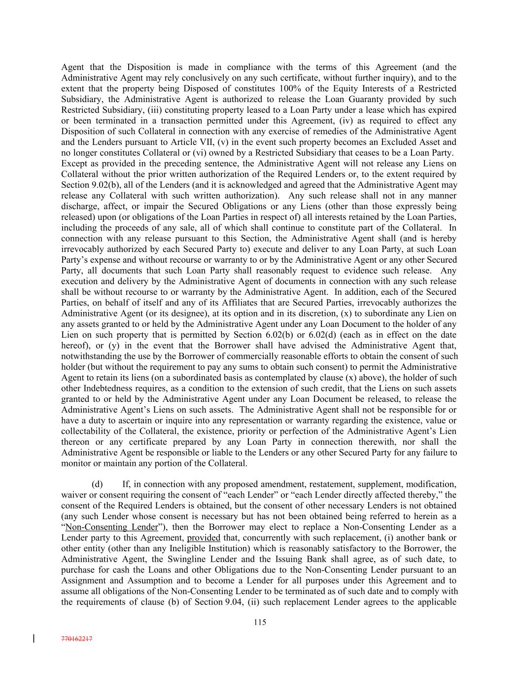 Agent that the Disposition is made in compliance with the terms of this Agreement (and the Administrative Agent may rely conclusively on any such certificate, without further inquiry), and to the extent that the property being Disposed of constitutes 100% of the Equity Interests of a Restricted Subsidiary, the Administrative Agent is authorized to release the Loan Guaranty provided by such Restricted Subsidiary, (iii) constituting property leased to a Loan Party under a lease which has expired or been terminated in a transaction permitted under this Agreement, (iv) as required to effect any Disposition of such Collateral in connection with any exercise of remedies of the Administrative Agent and the Lenders pursuant to Article VII, (v) in the event such property becomes an Excluded Asset and no longer constitutes Collateral or (vi) owned by a Restricted Subsidiary that ceases to be a Loan Party. Except as provided in the preceding sentence, the Administrative Agent will not release any Liens on Collateral without the prior written authorization of the Required Lenders or, to the extent required by Section 9.02(b), all of the Lenders (and it is acknowledged and agreed that the Administrative Agent may release any Collateral with such written authorization). Any such release shall not in any manner discharge, affect, or impair the Secured Obligations or any Liens (other than those expressly being released) upon (or obligations of the Loan Parties in respect of) all interests retained by the Loan Parties, including the proceeds of any sale, all of which shall continue to constitute part of the Collateral. In connection with any release pursuant to this Section, the Administrative Agent shall (and is hereby irrevocably authorized by each Secured Party to) execute and deliver to any Loan Party, at such Loan Party’s expense and without recourse or warranty to or by the Administrative Agent or any other Secured Party, all documents that such Loan Party shall reasonably request to evidence such release. Any execution and delivery by the Administrative Agent of documents in connection with any such release shall be without recourse to or warranty by the Administrative Agent. In addition, each of the Secured Parties, on behalf of itself and any of its Affiliates that are Secured Parties, irrevocably authorizes the Administrative Agent (or its designee), at its option and in its discretion, (x) to subordinate any Lien on any assets granted to or held by the Administrative Agent under any Loan Document to the holder of any Lien on such property that is permitted by Section 6.02(b) or 6.02(d) (each as in effect on the date hereof), or (y) in the event that the Borrower shall have advised the Administrative Agent that, notwithstanding the use by the Borrower of commercially reasonable efforts to obtain the consent of such holder (but without the requirement to pay any sums to obtain such consent) to permit the Administrative Agent to retain its liens (on a subordinated basis as contemplated by clause (x) above), the holder of such other Indebtedness requires, as a condition to the extension of such credit, that the Liens on such assets granted to or held by the Administrative Agent under any Loan Document be released, to release the Administrative Agent’s Liens on such assets. The Administrative Agent shall not be responsible for or have a duty to ascertain or inquire into any representation or warranty regarding the existence, value or collectability of the Collateral, the existence, priority or perfection of the Administrative Agent’s Lien thereon or any certificate prepared by any Loan Party in connection therewith, nor shall the Administrative Agent be responsible or liable to the Lenders or any other Secured Party for any failure to monitor or maintain any portion of the Collateral. (d) If, in connection with any proposed amendment, restatement, supplement, modification, waiver or consent requiring the consent of “each Lender” or “each Lender directly affected thereby,” the consent of the Required Lenders is obtained, but the consent of other necessary Lenders is not obtained (any such Lender whose consent is necessary but has not been obtained being referred to herein as a “Non-Consenting Lender”), then the Borrower may elect to replace a Non-Consenting Lender as a Lender party to this Agreement, provided that, concurrently with such replacement, (i) another bank or other entity (other than any Ineligible Institution) which is reasonably satisfactory to the Borrower, the Administrative Agent, the Swingline Lender and the Issuing Bank shall agree, as of such date, to purchase for cash the Loans and other Obligations due to the Non-Consenting Lender pursuant to an Assignment and Assumption and to become a Lender for all purposes under this Agreement and to assume all obligations of the Non-Consenting Lender to be terminated as of such date and to comply with the requirements of clause (b) of Section 9.04, (ii) such replacement Lender agrees to the applicable 115 770162217