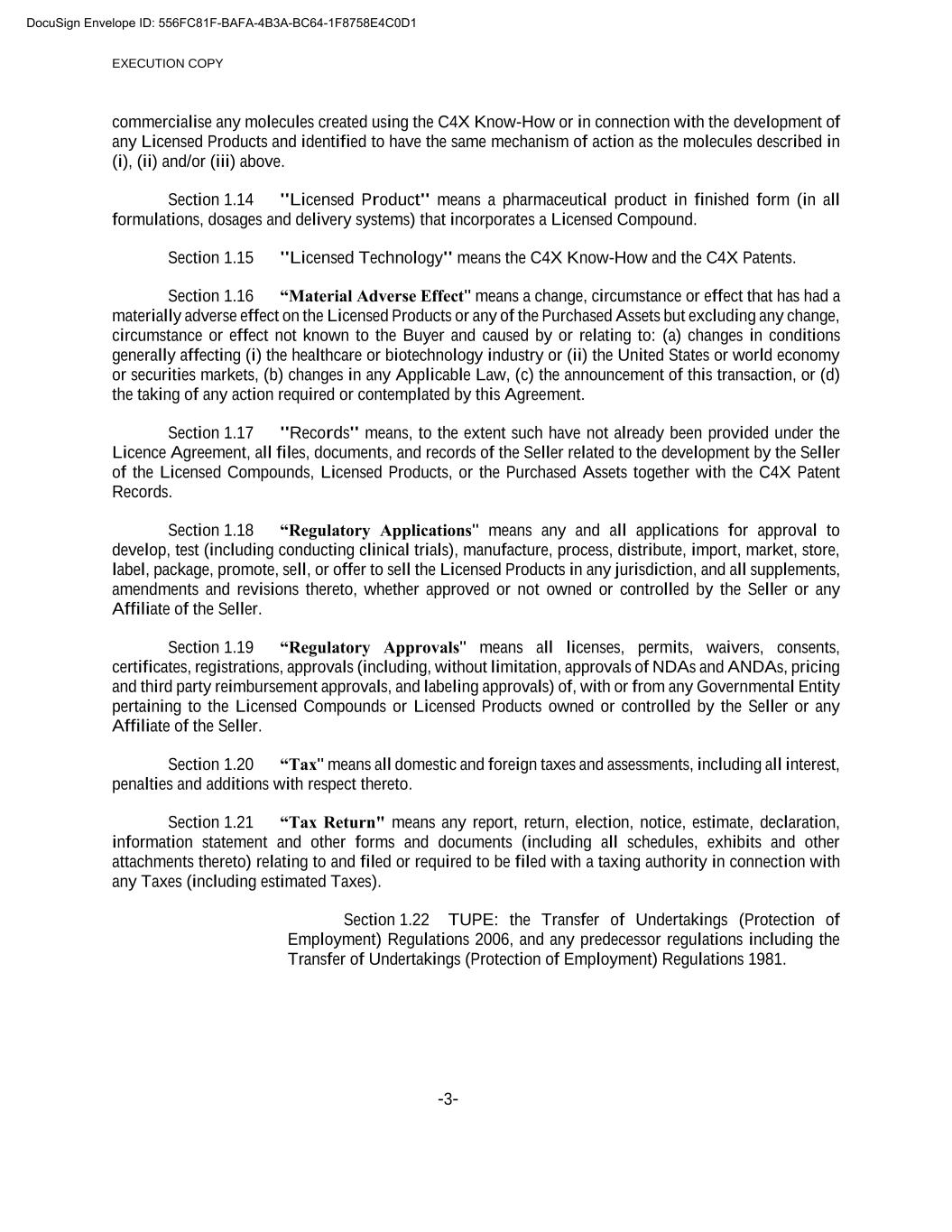 EXECUTION COPY -3- commercialise any molecules created using the C4X Know-How or in connection with the development of any Licensed Products and identified to have the same mechanism of action as the molecules described in (i), (ii) and/or (iii) above. Section 1.14 "Licensed Product" means a pharmaceutical product in finished form (in all formulations, dosages and delivery systems) that incorporates a Licensed Compound. Section 1.15 "Licensed Technology" means the C4X Know-How and the C4X Patents. Section 1.16 “Material Adverse Effect" means a change, circumstance or effect that has had a materially adverse effect on the Licensed Products or any of the Purchased Assets but excluding any change, circumstance or effect not known to the Buyer and caused by or relating to: (a) changes in conditions generally affecting (i) the healthcare or biotechnology industry or (ii) the United States or world economy or securities markets, (b) changes in any Applicable Law, (c) the announcement of this transaction, or (d) the taking of any action required or contemplated by this Agreement. Section 1.17 "Records" means, to the extent such have not already been provided under the Licence Agreement, all files, documents, and records of the Seller related to the development by the Seller of the Licensed Compounds, Licensed Products, or the Purchased Assets together with the C4X Patent Records. Section 1.18 “Regulatory Applications" means any and all applications for approval to develop, test (including conducting clinical trials), manufacture, process, distribute, import, market, store, label, package, promote, sell, or offer to sell the Licensed Products in any jurisdiction, and all supplements, amendments and revisions thereto, whether approved or not owned or controlled by the Seller or any Affiliate of the Seller. Section 1.19 “Regulatory Approvals" means all licenses, permits, waivers, consents, certificates, registrations, approvals (including, without limitation, approvals of NDAs and ANDAs, pricing and third party reimbursement approvals, and labeling approvals) of, with or from any Governmental Entity pertaining to the Licensed Compounds or Licensed Products owned or controlled by the Seller or any Affiliate of the Seller. Section 1.20 “Tax" means all domestic and foreign taxes and assessments, including all interest, penalties and additions with respect thereto. Section 1.21 “Tax Return" means any report, return, election, notice, estimate, declaration, information statement and other forms and documents (including all schedules, exhibits and other attachments thereto) relating to and filed or required to be filed with a taxing authority in connection with any Taxes (including estimated Taxes). Section 1.22 TUPE: the Transfer of Undertakings (Protection of Employment) Regulations 2006, and any predecessor regulations including the Transfer of Undertakings (Protection of Employment) Regulations 1981. DocuSign Envelope ID: 556FC81F-BAFA-4B3A-BC64-1F8758E4C0D1