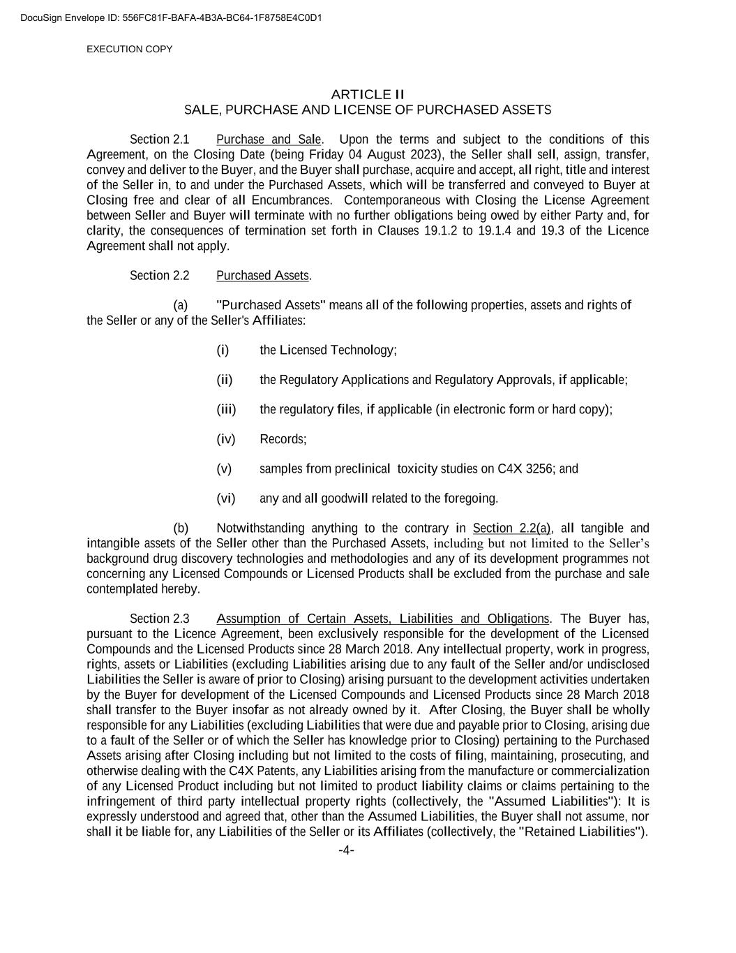 EXECUTION COPY -4- ARTICLE II SALE, PURCHASE AND LICENSE OF PURCHASED ASSETS Section 2.1 Purchase and Sale. Upon the terms and subject to the conditions of this Agreement, on the Closing Date (being Friday 04 August 2023), the Seller shall sell, assign, transfer, convey and deliver to the Buyer, and the Buyer shall purchase, acquire and accept, all right, title and interest of the Seller in, to and under the Purchased Assets, which will be transferred and conveyed to Buyer at Closing free and clear of all Encumbrances. Contemporaneous with Closing the License Agreement between Seller and Buyer will terminate with no further obligations being owed by either Party and, for clarity, the consequences of termination set forth in Clauses 19.1.2 to 19.1.4 and 19.3 of the Licence Agreement shall not apply. Section 2.2 Purchased Assets. (a) "Purchased Assets" means all of the following properties, assets and rights of the Seller or any of the Seller's Affiliates: (i) the Licensed Technology; (ii) the Regulatory Applications and Regulatory Approvals, if applicable; (iii) the regulatory files, if applicable (in electronic form or hard copy); (iv) Records; (v) samples from preclinical toxicity studies on C4X 3256; and (vi) any and all goodwill related to the foregoing. (b) Notwithstanding anything to the contrary in Section 2.2(a), all tangible and intangible assets of the Seller other than the Purchased Assets, including but not limited to the Seller’s background drug discovery technologies and methodologies and any of its development programmes not concerning any Licensed Compounds or Licensed Products shall be excluded from the purchase and sale contemplated hereby. Section 2.3 Assumption of Certain Assets, Liabilities and Obligations. The Buyer has, pursuant to the Licence Agreement, been exclusively responsible for the development of the Licensed Compounds and the Licensed Products since 28 March 2018. Any intellectual property, work in progress, rights, assets or Liabilities (excluding Liabilities arising due to any fault of the Seller and/or undisclosed Liabilities the Seller is aware of prior to Closing) arising pursuant to the development activities undertaken by the Buyer for development of the Licensed Compounds and Licensed Products since 28 March 2018 shall transfer to the Buyer insofar as not already owned by it. After Closing, the Buyer shall be wholly responsible for any Liabilities (excluding Liabilities that were due and payable prior to Closing, arising due to a fault of the Seller or of which the Seller has knowledge prior to Closing) pertaining to the Purchased Assets arising after Closing including but not limited to the costs of filing, maintaining, prosecuting, and otherwise dealing with the C4X Patents, any Liabilities arising from the manufacture or commercialization of any Licensed Product including but not limited to product liability claims or claims pertaining to the infringement of third party intellectual property rights (collectively, the "Assumed Liabilities"): It is expressly understood and agreed that, other than the Assumed Liabilities, the Buyer shall not assume, nor shall it be liable for, any Liabilities of the Seller or its Affiliates (collectively, the "Retained Liabilities"). DocuSign Envelope ID: 556FC81F-BAFA-4B3A-BC64-1F8758E4C0D1