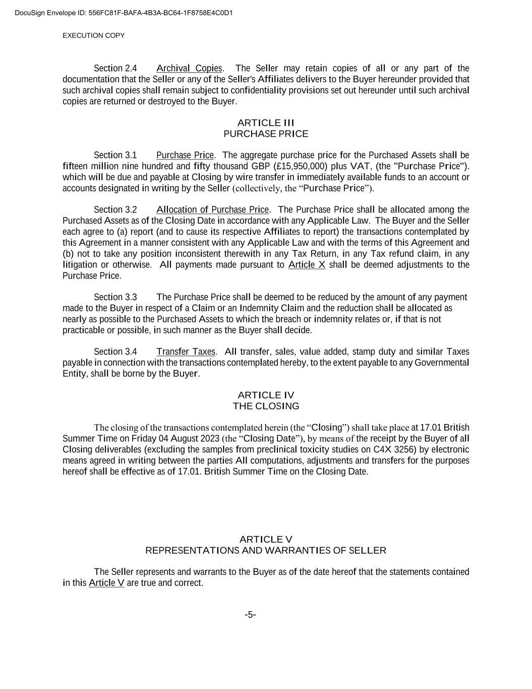 EXECUTION COPY -5- Section 2.4 Archival Copies. The Seller may retain copies of all or any part of the documentation that the Seller or any of the Seller's Affiliates delivers to the Buyer hereunder provided that such archival copies shall remain subject to confidentiality provisions set out hereunder until such archival copies are returned or destroyed to the Buyer. ARTICLE III PURCHASE PRICE Section 3.1 Purchase Price. The aggregate purchase price for the Purchased Assets shall be fifteen million nine hundred and fifty thousand GBP (£15,950,000) plus VAT, (the "Purchase Price"). which will be due and payable at Closing by wire transfer in immediately available funds to an account or accounts designated in writing by the Seller (collectively, the “Purchase Price”). Section 3.2 Allocation of Purchase Price. The Purchase Price shall be allocated among the Purchased Assets as of the Closing Date in accordance with any Applicable Law. The Buyer and the Seller each agree to (a) report (and to cause its respective Affiliates to report) the transactions contemplated by this Agreement in a manner consistent with any Applicable Law and with the terms of this Agreement and (b) not to take any position inconsistent therewith in any Tax Return, in any Tax refund claim, in any litigation or otherwise. All payments made pursuant to Article X shall be deemed adjustments to the Purchase Price. Section 3.3 The Purchase Price shall be deemed to be reduced by the amount of any payment made to the Buyer in respect of a Claim or an Indemnity Claim and the reduction shall be allocated as nearly as possible to the Purchased Assets to which the breach or indemnity relates or, if that is not practicable or possible, in such manner as the Buyer shall decide. Section 3.4 Transfer Taxes. All transfer, sales, value added, stamp duty and similar Taxes payable in connection with the transactions contemplated hereby, to the extent payable to any Governmental Entity, shall be borne by the Buyer. ARTICLE IV THE CLOSING The closing of the transactions contemplated herein (the “Closing”) shall take place at 17.01 British Summer Time on Friday 04 August 2023 (the “Closing Date”), by means of the receipt by the Buyer of all Closing deliverables (excluding the samples from preclinical toxicity studies on C4X 3256) by electronic means agreed in writing between the parties All computations, adjustments and transfers for the purposes hereof shall be effective as of 17.01. British Summer Time on the Closing Date. ARTICLE V REPRESENTATIONS AND WARRANTIES OF SELLER The Seller represents and warrants to the Buyer as of the date hereof that the statements contained in this Article V are true and correct. DocuSign Envelope ID: 556FC81F-BAFA-4B3A-BC64-1F8758E4C0D1