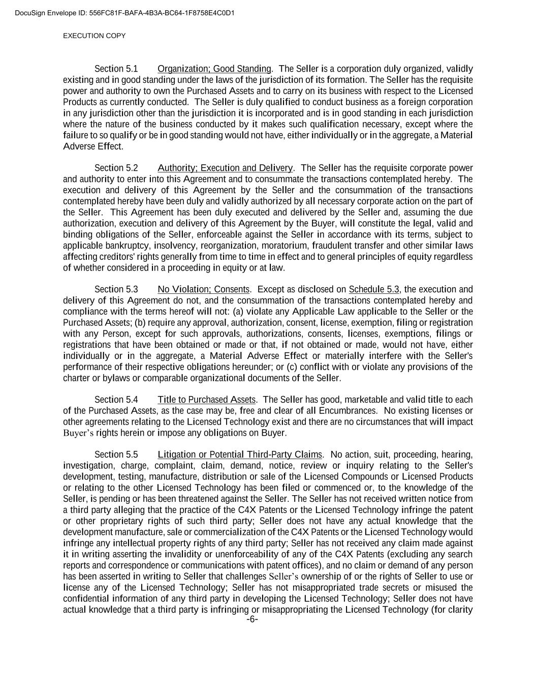EXECUTION COPY -6- Section 5.1 Organization; Good Standing. The Seller is a corporation duly organized, validly existing and in good standing under the laws of the jurisdiction of its formation. The Seller has the requisite power and authority to own the Purchased Assets and to carry on its business with respect to the Licensed Products as currently conducted. The Seller is duly qualified to conduct business as a foreign corporation in any jurisdiction other than the jurisdiction it is incorporated and is in good standing in each jurisdiction where the nature of the business conducted by it makes such qualification necessary, except where the failure to so qualify or be in good standing would not have, either individually or in the aggregate, a Material Adverse Effect. Section 5.2 Authority; Execution and Delivery. The Seller has the requisite corporate power and authority to enter into this Agreement and to consummate the transactions contemplated hereby. The execution and delivery of this Agreement by the Seller and the consummation of the transactions contemplated hereby have been duly and validly authorized by all necessary corporate action on the part of the Seller. This Agreement has been duly executed and delivered by the Seller and, assuming the due authorization, execution and delivery of this Agreement by the Buyer, will constitute the legal, valid and binding obligations of the Seller, enforceable against the Seller in accordance with its terms, subject to applicable bankruptcy, insolvency, reorganization, moratorium, fraudulent transfer and other similar laws affecting creditors' rights generally from time to time in effect and to general principles of equity regardless of whether considered in a proceeding in equity or at law. Section 5.3 No Violation; Consents. Except as disclosed on Schedule 5.3, the execution and delivery of this Agreement do not, and the consummation of the transactions contemplated hereby and compliance with the terms hereof will not: (a) violate any Applicable Law applicable to the Seller or the Purchased Assets; (b) require any approval, authorization, consent, license, exemption, filing or registration with any Person, except for such approvals, authorizations, consents, licenses, exemptions, filings or registrations that have been obtained or made or that, if not obtained or made, would not have, either individually or in the aggregate, a Material Adverse Effect or materially interfere with the Seller's performance of their respective obligations hereunder; or (c) conflict with or violate any provisions of the charter or bylaws or comparable organizational documents of the Seller. Section 5.4 Title to Purchased Assets. The Seller has good, marketable and valid title to each of the Purchased Assets, as the case may be, free and clear of all Encumbrances. No existing licenses or other agreements relating to the Licensed Technology exist and there are no circumstances that will impact Buyer’s rights herein or impose any obligations on Buyer. Section 5.5 Litigation or Potential Third-Party Claims. No action, suit, proceeding, hearing, investigation, charge, complaint, claim, demand, notice, review or inquiry relating to the Seller's development, testing, manufacture, distribution or sale of the Licensed Compounds or Licensed Products or relating to the other Licensed Technology has been filed or commenced or, to the knowledge of the Seller, is pending or has been threatened against the Seller. The Seller has not received written notice from a third party alleging that the practice of the C4X Patents or the Licensed Technology infringe the patent or other proprietary rights of such third party; Seller does not have any actual knowledge that the development manufacture, sale or commercialization of the C4X Patents or the Licensed Technology would infringe any intellectual property rights of any third party; Seller has not received any claim made against it in writing asserting the invalidity or unenforceability of any of the C4X Patents (excluding any search reports and correspondence or communications with patent offices), and no claim or demand of any person has been asserted in writing to Seller that challenges Seller’s ownership of or the rights of Seller to use or license any of the Licensed Technology; Seller has not misappropriated trade secrets or misused the confidential information of any third party in developing the Licensed Technology; Seller does not have actual knowledge that a third party is infringing or misappropriating the Licensed Technology (for clarity DocuSign Envelope ID: 556FC81F-BAFA-4B3A-BC64-1F8758E4C0D1