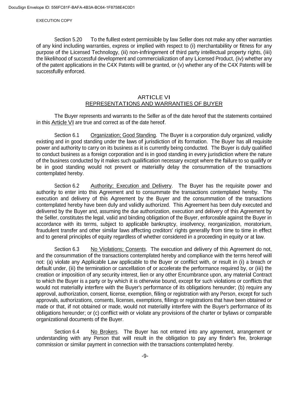 EXECUTION COPY -9- Section 5.20 To the fullest extent permissible by law Seller does not make any other warranties of any kind including warranties, express or implied with respect to (i) merchantability or fitness for any purpose of the Licensed Technology, (ii) non-infringement of third party intellectual property rights, (iii) the likelihood of successful development and commercialization of any Licensed Product, (iv) whether any of the patent applications in the C4X Patents will be granted, or (v) whether any of the C4X Patents will be successfully enforced. ARTICLE VI REPRESENTATIONS AND WARRANTIES OF BUYER The Buyer represents and warrants to the Seller as of the date hereof that the statements contained in this Article VI are true and correct as of the date hereof. Section 6.1 Organization; Good Standing. The Buyer is a corporation duly organized, validly existing and in good standing under the laws of jurisdiction of its formation. The Buyer has all requisite power and authority to carry on its business as it is currently being conducted. The Buyer is duly qualified to conduct business as a foreign corporation and is in good standing in every jurisdiction where the nature of the business conducted by it makes such qualification necessary except where the failure to so qualify or be in good standing would not prevent or materially delay the consummation of the transactions contemplated hereby. Section 6.2 Authority; Execution and Delivery. The Buyer has the requisite power and authority to enter into this Agreement and to consummate the transactions contemplated hereby. The execution and delivery of this Agreement by the Buyer and the consummation of the transactions contemplated hereby have been duly and validly authorized. This Agreement has been duly executed and delivered by the Buyer and, assuming the due authorization, execution and delivery of this Agreement by the Seller, constitutes the legal, valid and binding obligation of the Buyer, enforceable against the Buyer in accordance with its terms, subject to applicable bankruptcy, insolvency, reorganization, moratorium, fraudulent transfer and other similar laws affecting creditors' rights generally from time to time in effect and to general principles of equity regardless of whether considered in a proceeding in equity or at law. Section 6.3 No Violations; Consents. The execution and delivery of this Agreement do not, and the consummation of the transactions contemplated hereby and compliance with the terms hereof will not: (a) violate any Applicable Law applicable to the Buyer or conflict with, or result in (i) a breach or default under, (ii) the termination or cancellation of or accelerate the performance required by, or (iii) the creation or imposition of any security interest, lien or any other Encumbrance upon, any material Contract to which the Buyer is a party or by which it is otherwise bound, except for such violations or conflicts that would not materially interfere with the Buyer's performance of its obligations hereunder; (b) require any approval, authorization, consent, license, exemption, filing or registration with any Person, except for such approvals, authorizations, consents, licenses, exemptions, filings or registrations that have been obtained or made or that, if not obtained or made, would not materially interfere with the Buyer's performance of its obligations hereunder; or (c) conflict with or violate any provisions of the charter or bylaws or comparable organizational documents of the Buyer. Section 6.4 No Brokers. The Buyer has not entered into any agreement, arrangement or understanding with any Person that will result in the obligation to pay any finder's fee, brokerage commission or similar payment in connection with the transactions contemplated hereby. DocuSign Envelope ID: 556FC81F-BAFA-4B3A-BC64-1F8758E4C0D1
