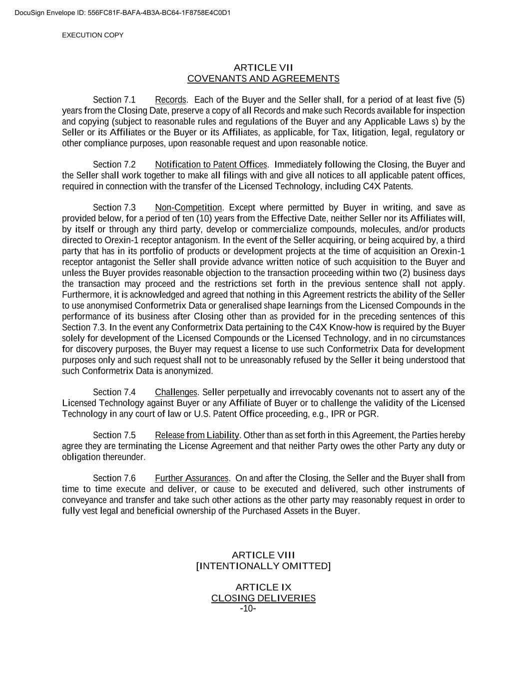 EXECUTION COPY -10- ARTICLE VII COVENANTS AND AGREEMENTS Section 7.1 Records. Each of the Buyer and the Seller shall, for a period of at least five (5) years from the Closing Date, preserve a copy of all Records and make such Records available for inspection and copying (subject to reasonable rules and regulations of the Buyer and any Applicable Laws s) by the Seller or its Affiliates or the Buyer or its Affiliates, as applicable, for Tax, litigation, legal, regulatory or other compliance purposes, upon reasonable request and upon reasonable notice. Section 7.2 Notification to Patent Offices. Immediately following the Closing, the Buyer and the Seller shall work together to make all filings with and give all notices to all applicable patent offices, required in connection with the transfer of the Licensed Technology, including C4X Patents. Section 7.3 Non-Competition. Except where permitted by Buyer in writing, and save as provided below, for a period of ten (10) years from the Effective Date, neither Seller nor its Affiliates will, by itself or through any third party, develop or commercialize compounds, molecules, and/or products directed to Orexin-1 receptor antagonism. In the event of the Seller acquiring, or being acquired by, a third party that has in its portfolio of products or development projects at the time of acquisition an Orexin-1 receptor antagonist the Seller shall provide advance written notice of such acquisition to the Buyer and unless the Buyer provides reasonable objection to the transaction proceeding within two (2) business days the transaction may proceed and the restrictions set forth in the previous sentence shall not apply. Furthermore, it is acknowledged and agreed that nothing in this Agreement restricts the ability of the Seller to use anonymised Conformetrix Data or generalised shape learnings from the Licensed Compounds in the performance of its business after Closing other than as provided for in the preceding sentences of this Section 7.3. In the event any Conformetrix Data pertaining to the C4X Know-how is required by the Buyer solely for development of the Licensed Compounds or the Licensed Technology, and in no circumstances for discovery purposes, the Buyer may request a license to use such Conformetrix Data for development purposes only and such request shall not to be unreasonably refused by the Seller it being understood that such Conformetrix Data is anonymized. Section 7.4 Challenges. Seller perpetually and irrevocably covenants not to assert any of the Licensed Technology against Buyer or any Affiliate of Buyer or to challenge the validity of the Licensed Technology in any court of law or U.S. Patent Office proceeding, e.g., IPR or PGR. Section 7.5 Release from Liability. Other than as set forth in this Agreement, the Parties hereby agree they are terminating the License Agreement and that neither Party owes the other Party any duty or obligation thereunder. Section 7.6 Further Assurances. On and after the Closing, the Seller and the Buyer shall from time to time execute and deliver, or cause to be executed and delivered, such other instruments of conveyance and transfer and take such other actions as the other party may reasonably request in order to fully vest legal and beneficial ownership of the Purchased Assets in the Buyer. ARTICLE VIII [INTENTIONALLY OMITTED] ARTICLE IX CLOSING DELIVERIES DocuSign Envelope ID: 556FC81F-BAFA-4B3A-BC64-1F8758E4C0D1