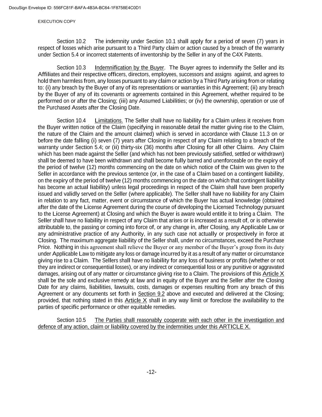 EXECUTION COPY -12- Section 10.2 The indemnity under Section 10.1 shall apply for a period of seven (7) years in respect of losses which arise pursuant to a Third Party claim or action caused by a breach of the warranty under Section 5.4 or incorrect statements of inventorship by the Seller in any of the C4X Patents. Section 10.3 Indemnification by the Buyer. The Buyer agrees to indemnify the Seller and its Affiliates and their respective officers, directors, employees, successors and assigns against, and agrees to hold them harmless from, any losses pursuant to any claim or action by a Third Party arising from or relating to: (i) any breach by the Buyer of any of its representations or warranties in this Agreement; (ii) any breach by the Buyer of any of its covenants or agreements contained in this Agreement, whether required to be performed on or after the Closing; (iii) any Assumed Liabilities; or (iv) the ownership, operation or use of the Purchased Assets after the Closing Date. Section 10.4 Limitations. The Seller shall have no liability for a Claim unless it receives from the Buyer written notice of the Claim (specifying in reasonable detail the matter giving rise to the Claim, the nature of the Claim and the amount claimed) which is served in accordance with Clause 11.3 on or before the date falling (i) seven (7) years after Closing in respect of any Claim relating to a breach of the warranty under Section 5.4; or (ii) thirty-six (36) months after Closing for all other Claims. Any Claim which has been made against the Seller (and which has not been previously satisfied, settled or withdrawn) shall be deemed to have been withdrawn and shall become fully barred and unenforceable on the expiry of the period of twelve (12) months commencing on the date on which notice of the Claim was given to the Seller in accordance with the previous sentence (or, in the case of a Claim based on a contingent liability, on the expiry of the period of twelve (12) months commencing on the date on which that contingent liability has become an actual liability) unless legal proceedings in respect of the Claim shall have been properly issued and validly served on the Seller (where applicable). The Seller shall have no liability for any Claim in relation to any fact, matter, event or circumstance of which the Buyer has actual knowledge (obtained after the date of the License Agreement during the course of developing the Licensed Technology pursuant to the License Agreement) at Closing and which the Buyer is aware would entitle it to bring a Claim. The Seller shall have no liability in respect of any Claim that arises or is increased as a result of, or is otherwise attributable to, the passing or coming into force of, or any change in, after Closing, any Applicable Law or any administrative practice of any Authority, in any such case not actually or prospectively in force at Closing. The maximum aggregate liability of the Seller shall, under no circumstances, exceed the Purchase Price. Nothing in this agreement shall relieve the Buyer or any member of the Buyer’s group from its duty under Applicable Law to mitigate any loss or damage incurred by it as a result of any matter or circumstance giving rise to a Claim. The Sellers shall have no liability for any loss of business or profits (whether or not they are indirect or consequential losses), or any indirect or consequential loss or any punitive or aggravated damages, arising out of any matter or circumstance giving rise to a Claim. The provisions of this Article X shall be the sole and exclusive remedy at law and in equity of the Buyer and the Seller after the Closing Date for any claims, liabilities, lawsuits, costs, damages or expenses resulting from any breach of this Agreement or any documents set forth in Section 9.2 above and executed and delivered at the Closing; provided, that nothing stated in this Article X shall in any way limit or foreclose the availability to the parties of specific performance or other equitable remedies. Section 10.5 The Parties shall reasonably cooperate with each other in the investigation and defence of any action, claim or liability covered by the indemnities under this ARTICLE X. DocuSign Envelope ID: 556FC81F-BAFA-4B3A-BC64-1F8758E4C0D1