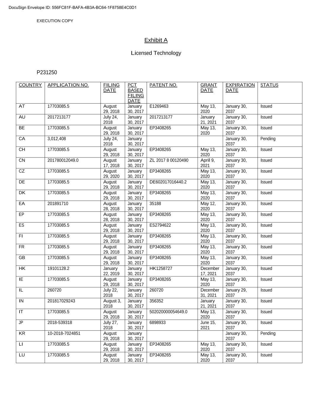 EXECUTION COPY Exhibit A Licensed Technology P231250 COUNTRY APPLICATION NO. FILING DATE PCT BASED FILING DATE PATENT NO. GRANT DATE EXPIRATION DATE STATUS AT 17703085.5 August 29, 2018 January 30, 2017 E1269463 May 13, 2020 January 30, 2037 Issued AU 2017213177 July 24, 2018 January 30, 2017 2017213177 January 21, 2021 January 30, 2037 Issued BE 17703085.5 August 29, 2018 January 30, 2017 EP3408265 May 13, 2020 January 30, 2037 Issued CA 3,012,408 July 24, 2018 January 30, 2017 January 30, 2037 Pending CH 17703085.5 August 29, 2018 January 30, 2017 EP3408265 May 13, 2020 January 30, 2037 Issued CN 201780012049.0 August 17, 2018 January 30, 2017 ZL 2017 8 00120490 April 9, 2021 January 30, 2037 Issued CZ 17703085.5 August 29, 2020 January 30, 2017 EP3408265 May 13, 2020 January 30, 2037 Issued DE 17703085.5 August 29, 2018 January 30, 2017 DE602017016440.2 May 13, 2020 January 30, 2037 Issued DK 17703085.5 August 29, 2018 January 30, 2017 EP3408265 May 13, 2020 January 30, 2037 Issued EA 201891710 August 28, 2018 January 30, 2017 35188 May 12, 2020 January 30, 2037 Issued EP 17703085.5 August 28, 2018 January 30, 2017 EP3408265 May 13, 2020 January 30, 2037 Issued ES 17703085.5 August 29, 2018 January 30, 2017 ES2794622 May 13, 2020 January 30, 2037 Issued FI 17703085.5 August 29, 2018 January 30, 2017 EP3408265 May 13, 2020 January 30, 2037 Issued FR 17703085.5 August 29, 2018 January 30, 2017 EP3408265 May 13, 2020 January 30, 2037 Issued GB 17703085.5 August 29, 2018 January 30, 2017 EP3408265 May 13, 2020 January 30, 2037 Issued HK 19101128.2 January 22, 2019 January 30, 2017 HK1258727 December 17, 2021 January 30, 2037 Issued IE 17703085.5 August 29, 2018 January 30, 2017 EP3408265 May 13, 2020 January 30, 2037 Issued IL 260720 July 22, 2018 January 30, 2017 260720 December 31, 2021 January 29, 2037 Issued IN 201817029243 August 3, 2018 January 30, 2017 356352 January 21, 2021 January 30, 2037 Issued IT 17703085.5 August 29, 2018 January 30, 2017 502020000054649.0 May 13, 2020 January 30, 2037 Issued JP 2018-539318 July 27, 2018 January 30, 2017 6898933 June 15, 2021 January 30, 2037 Issued KR 10-2018-7024851 August 29, 2018 January 30, 2017 January 30, 2037 Pending LI 17703085.5 August 29, 2018 January 30, 2017 EP3408265 May 13, 2020 January 30, 2037 Issued LU 17703085.5 August 29, 2018 January 30, 2017 EP3408265 May 13, 2020 January 30, 2037 Issued DocuSign Envelope ID: 556FC81F-BAFA-4B3A-BC64-1F8758E4C0D1