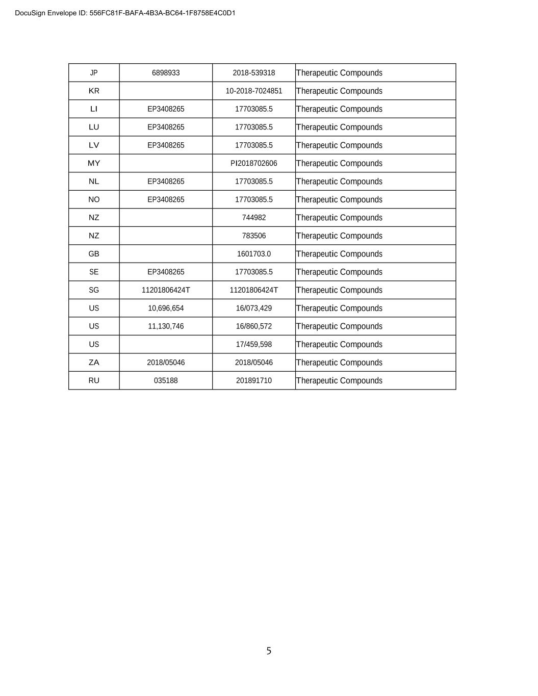 5 JP 6898933 2018-539318 Therapeutic Compounds KR 10-2018-7024851 Therapeutic Compounds LI EP3408265 17703085.5 Therapeutic Compounds LU EP3408265 17703085.5 Therapeutic Compounds LV EP3408265 17703085.5 Therapeutic Compounds MY PI2018702606 Therapeutic Compounds NL EP3408265 17703085.5 Therapeutic Compounds NO EP3408265 17703085.5 Therapeutic Compounds NZ 744982 Therapeutic Compounds NZ 783506 Therapeutic Compounds GB 1601703.0 Therapeutic Compounds SE EP3408265 17703085.5 Therapeutic Compounds SG 11201806424T 11201806424T Therapeutic Compounds US 10,696,654 16/073,429 Therapeutic Compounds US 11,130,746 16/860,572 Therapeutic Compounds US 17/459,598 Therapeutic Compounds ZA 2018/05046 2018/05046 Therapeutic Compounds RU 035188 201891710 Therapeutic Compounds DocuSign Envelope ID: 556FC81F-BAFA-4B3A-BC64-1F8758E4C0D1