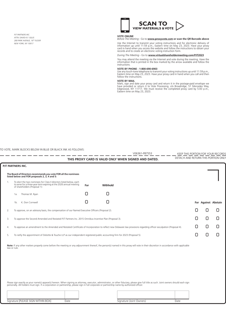 We cordially invite you to attend our 2023 Annual Meeting of Shareholders, to be held on May 24, 2023, at 10:30 a.m., Eastern Time. The Annual Meeting will be a virtual meeting of shareholders. You will be able to attend the Annual Meeting, vote your shares electronically and submit your questions during the meeting via live audio webcast by visiting www.virtualshareholdermeeting.com/PJT2023. To participate in the meeting, you must have your 16-Digit Control Number that is shown on your Notice of Internet Availability of Proxy Materials or on your proxy card if you elected to receive proxy materials by mail. You will not be able to attend the Annual Meeting in person.