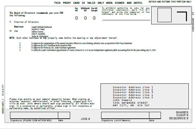 | 5. | To ratify the Audit Committee's appointment of Turner, Stone & Co. LLP as our independent registered public accounting firm for the year ending July 31, 2021; and |