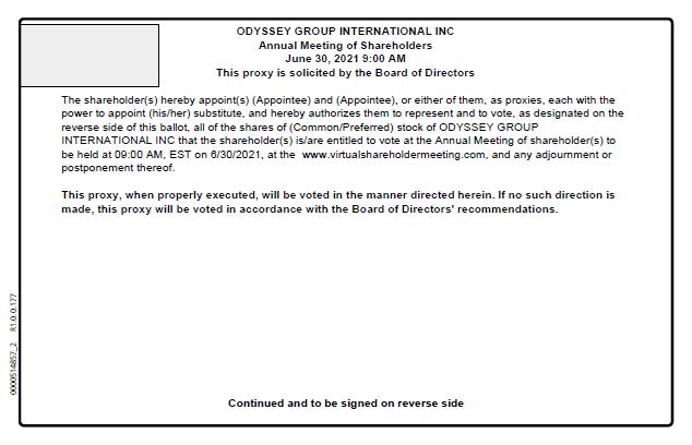 The annual meeting of shareholders of Odyssey Group International, Inc. will be held at the law offices of Brinen & Associates, LLC, 90 Broad Street, Tenth Floor, New York, New York 10004 on Wednesday, June 30, 2021, at 10:00 a.m. Eastern Daylight Time. With the health and well-being of our shareholders, employees, directors, auditors, and those corporate partners who normally attend the annual meeting in mind, this year's annual meeting will also be conducted via live webcast. You will be able to participate in the annual meeting of shareholders online, and submit your questions during the meeting by visiting https://us04web.zoom.us/meeting/register/upIlc-6rpzMtHtaThhqkF8A9ZeMG-lLLsA52, for the following purposes: