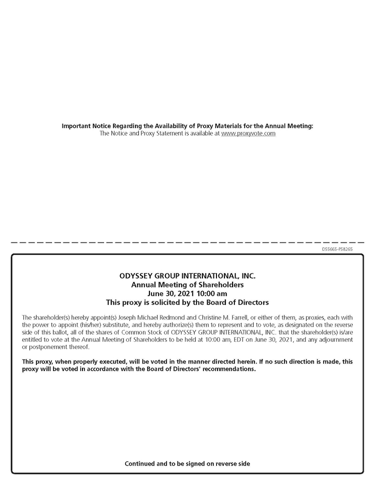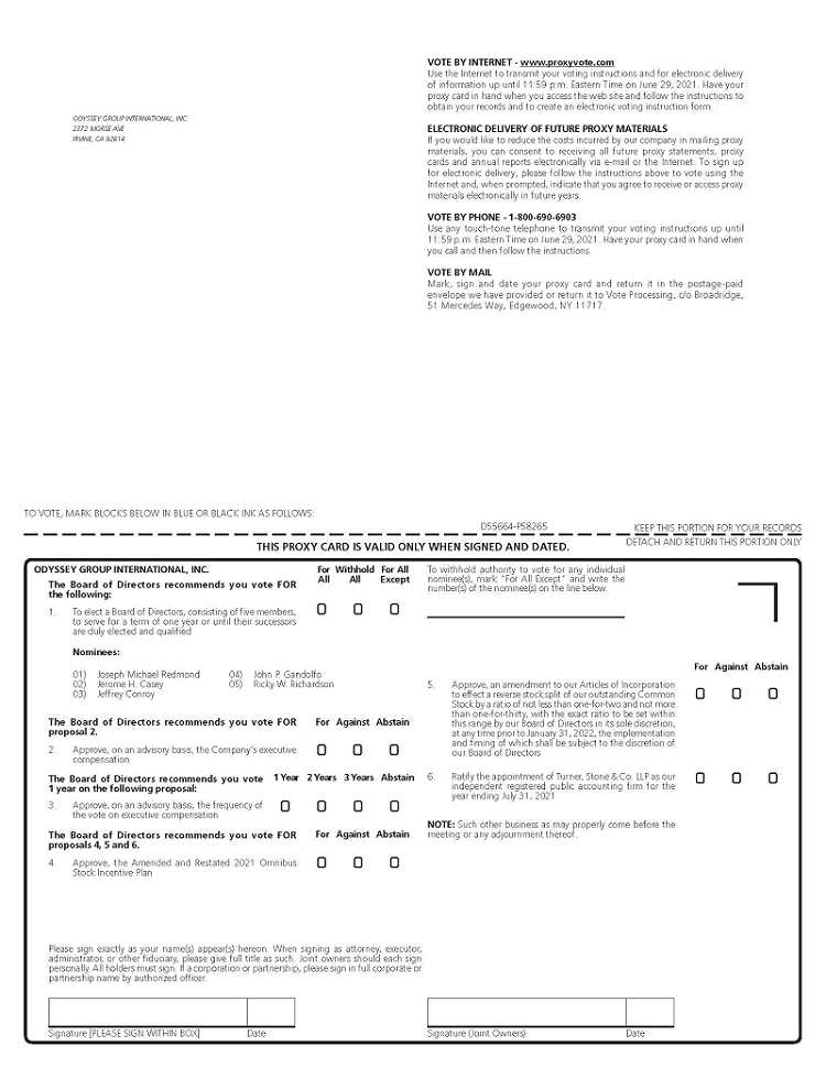 Pursuant to rules promulgated by the Securities and Exchange Commission (the “SEC”), we have elected to provide access to our proxy materials both by sending you this full set of proxy materials, including a Notice of Annual Meeting and a 2020 Annual Report to Stockholders, and by notifying you of the availability of our proxy materials on the Internet. The Notice of Annual Meeting, Proxy Statement and 2020 Annual Report to Stockholders are available at http://www.odysseygi.com. In accordance with the SEC rules, the materials on the website are searchable, readable and printable, and the website does not have “cookies” or other tracking devices which identify visitors.