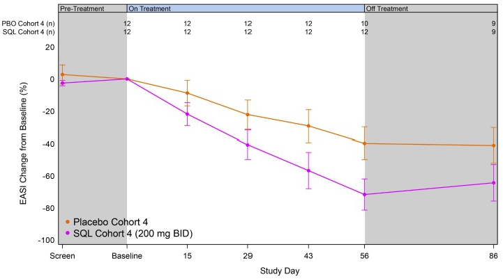 At day 56, the mean percent reduction in EASI for patients receiving soquelitinib in cohort 4 (n=12) was 72%, compared to 40% for patients receiving placebo (n=10). The kinetics of response demonstrated continuous improvement from day 28 to day 56 with widening separation of the response curve compared to the placebo. Two placebo patients experienced disease flares requiring therapy during the 56-day treatment period compared to none in the soquelitinib group.
