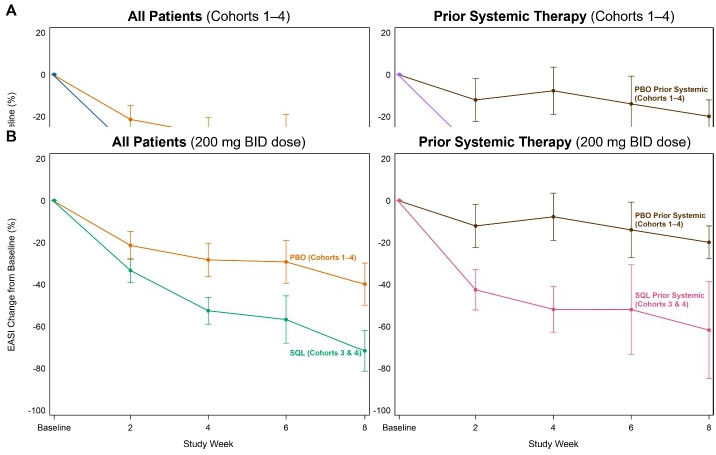 Figure 3A and 3B below show the response curves for soquelitinib and placebo patients across all patients in cohorts 1-4 and in patients in cohorts 3-4 only, also segmented into sub-groups by those who had or had not received prior systemic therapies. Across all four cohorts, 25 patients (35% of all patients) received prior systemic therapies with dupilumab being the most common prior systemic therapy (n=11). Other prior systemic therapies included JAK inhibitors, corticosteroids and investigational agents. The response curves are nearly identical for soquelitinib treated patients, regardless of their history of prior systemic therapy. Placebo patients who had prior systemic therapy had a lesser reduction in EASI compared to placebo patients who had not received prior systemic therapy. These Phase 1 results show separation of the curves for patients receiving soquelitinib compared to placebo and demonstrate that soquelitinib was similarly active in both systemic treatment naïve or experienced patients. Also, prior systemic therapy experienced patients appeared to have worse disease. The two placebo patients who achieved EASI 75 had not received prior systemic therapy. None of the seven placebo patients who had received prior systemic therapy achieved EASI 75 or EASI 50; whereas, three of the five soquelitinib treated patients who received prior systemic therapy achieved EASI 75.