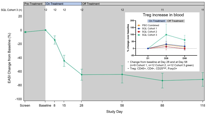 Figure 4 below shows longer follow up from cohort 3 patients, who also received the 200 mg twice-daily dose. The data show maintenance or improvement in EASI out to 3 months beyond the treatment period and an increase of circulating Treg cells.